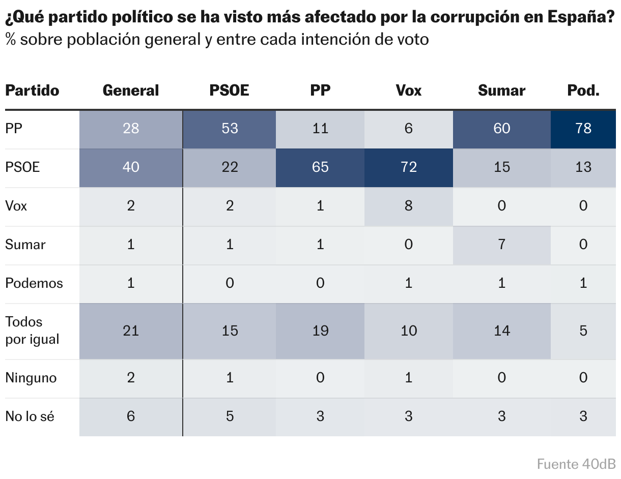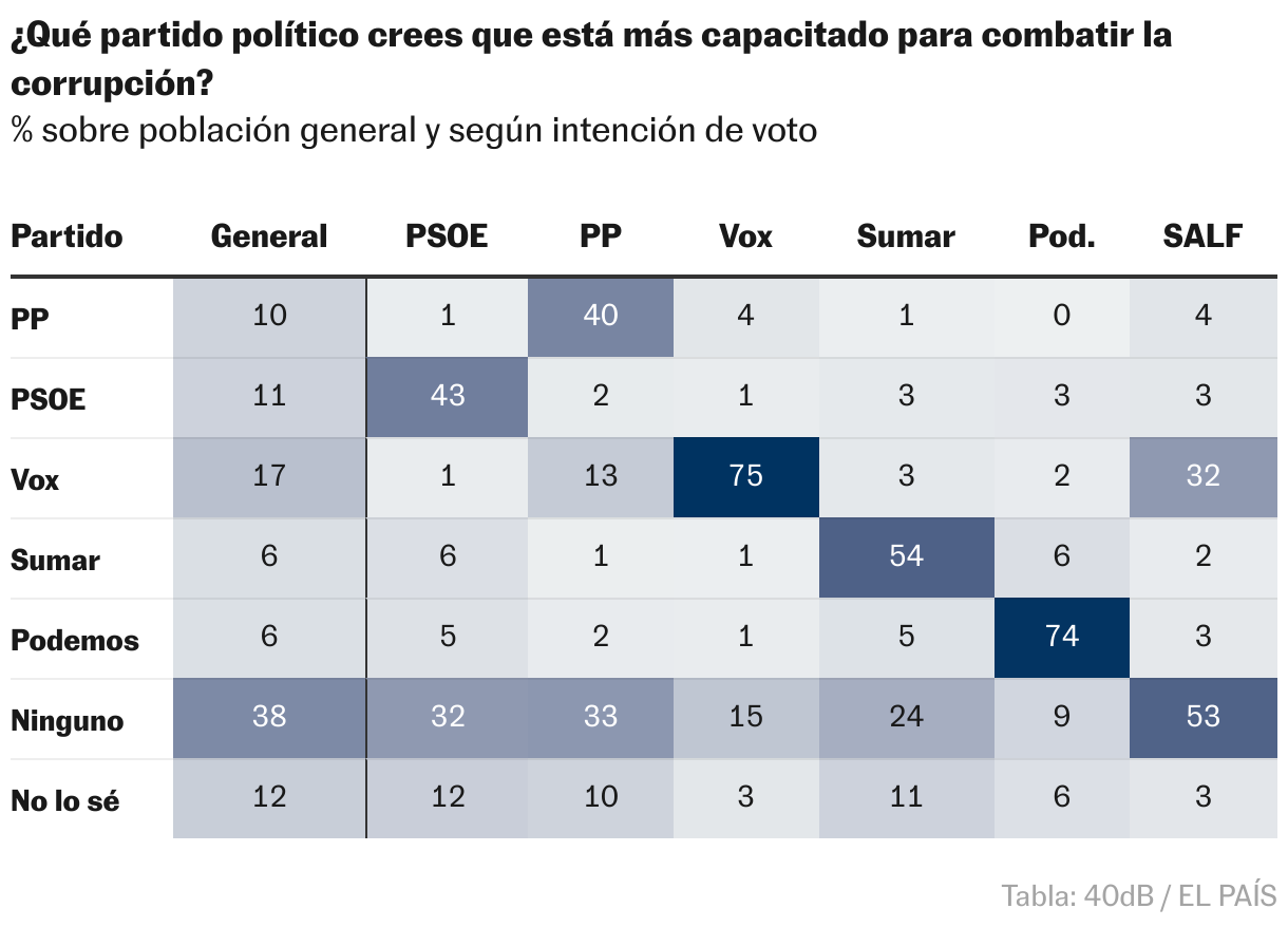 Para la mayoría de los votantes del PP (71,3%) y Vox (58,2%), el caso Cerdán refleja un “síntoma de un problema más amplio de corrupción estructural en el PSOE”; mientras que para buena parte de los seguidores socialistas (46,2%) es un “hecho aislado que afecta a unas pocas personas que actuaron por beneficio propio”. La mayoría de votantes de Podemos (62,3%) y Sumar (51%) cree que es un “ejemplo de las prácticas de los dos grandes partidos” —esta respuesta cae al 35,6% entre los seguidores del PSOE; al 34,8%, entre los de Vox; y al 21,2%, entre los del PP—.