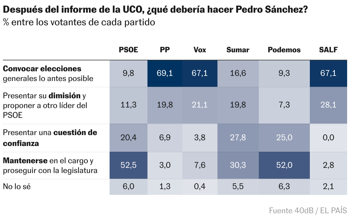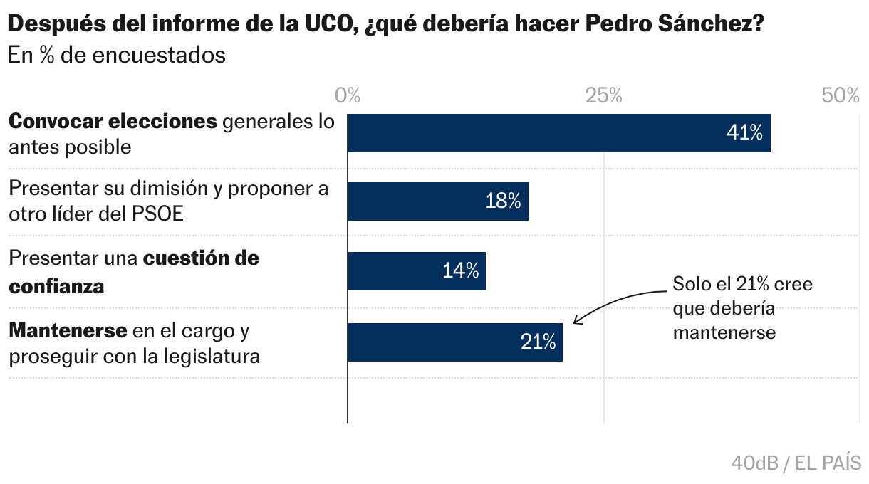 En la encuesta, el instituto 40dB. puso sobre la mesa la siguiente pregunta: “¿Qué debería hacer Pedro Sánchez tras la aparición del informe de la UCO?”. La respuesta mayoritaria fue “convocar elecciones generales lo antes posible”, con un 41,2%; seguida muy por detrás de “mantenerse en el cargo y proseguir con la legislatura” (21%); “presentar su dimisión y proponer otro líder del PSOE” (17,6%); y finalmente optar por “una cuestión de confianza” (13,5%).