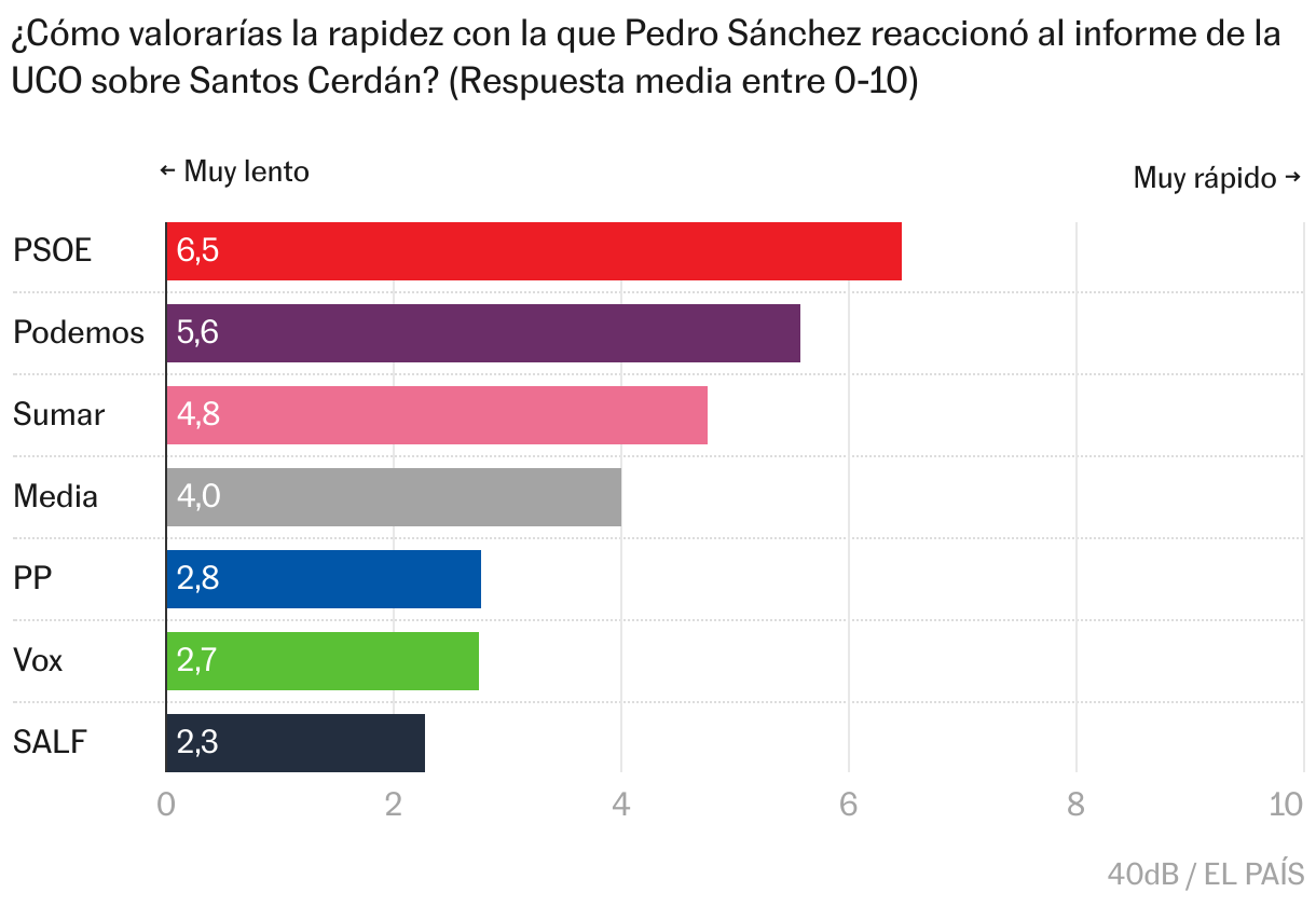 Gran parte de los encuestados considera igualmente que el presidente arrastró los pies al reaccionar ante el informe de la UCO. En una escala del 0 al 10 (de “muy lento” a “muy rápido”), un 47,8% le otorga una nota de 4 o menos; frente al 15,2% que le concede un 5; y el 29,2% que le da un 6 o más. La nota media se sitúa en el 4 (en este parámetro, los votantes del PSOE le puntúan con un 6,5; los de Podemos, con un 5,6; los de Sumar, con un 4,8; los del PP, con un 2,8; y los de Vox, con un 2,7).