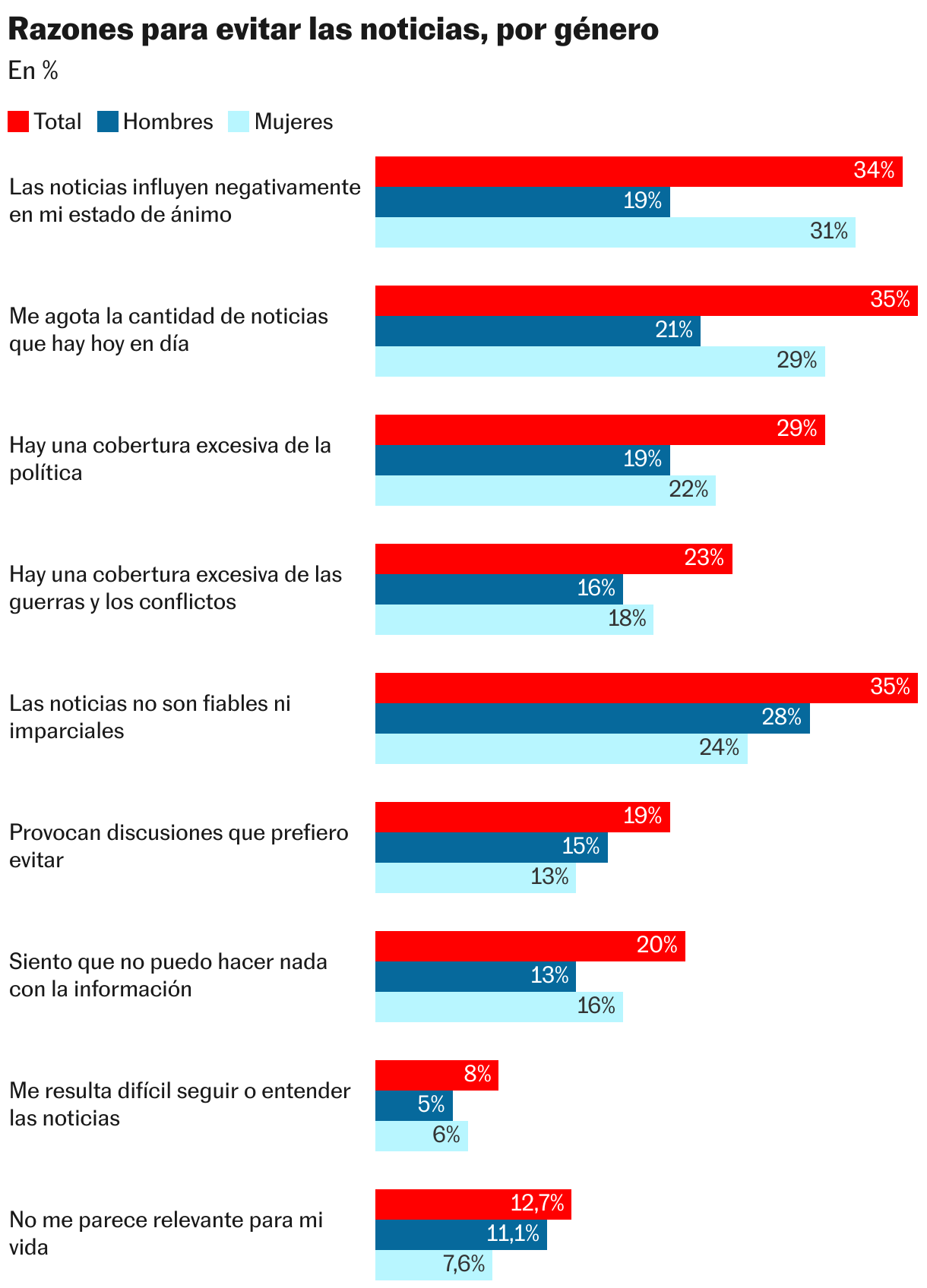 Otro de los desafíos para los medios de comunicación que apuntala el Instituto Reuters es la consolidación de la fatiga informativa. El porcentaje histórico de encuestados que evita las noticias registrado hace un año en el 37% a nivel global alcanza ya el 40%, mientras que en 2017 la cifra era del 29%. Entre las razones más citadas para mostrar desinterés por las noticias están el efecto negativo en el estado de ánimo, la sobrecarga informativa y una estimación de “demasiada cobertura de guerras y conflictos o política nacional”. En paralelo, el informe añade apreciaciones para incrementar la confianza en los medios: “Más rigurosidad, transparencia y periodismo original, y menos cobertura sesgada”.