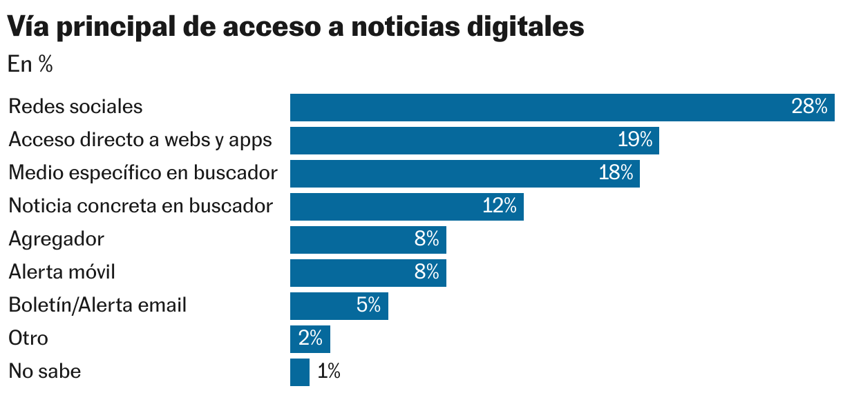 El nuevo informe anual del Instituto Reuters analiza casi 100.000 entrevistas realizadas en medio centenar de países (unas 2.000 encuestas online en cada país) entre finales del pasado enero y principios de febrero, a través de la compañía de investigación de mercados YouGov. En el procesamiento de los resultados para el mercado español, desarrollados durante los meses previos a la gravísima crisis de los últimos días por el escándalo de corrupción en la cúpula del PSOE, han participado varios investigadores de la Universidad de Navarra. Sus conclusiones encuadran en España un consumo actual de noticias “más complejo que nunca: multipantalla, descentralizado, fragmentado y altamente personalizado”. Mientras que las redes sociales compiten con la televisión como fuentes principales, “los algoritmos superan a las marcas como puerta de entrada y formatos como el vídeo o el podcast ganan terreno”. Esta tendencia se refleja en los resultados globales del estudio para un 44% de los jóvenes de 18 a 24 años que encuentran en las redes sociales y las plataformas de vídeo sus principales medios de consumir noticias.