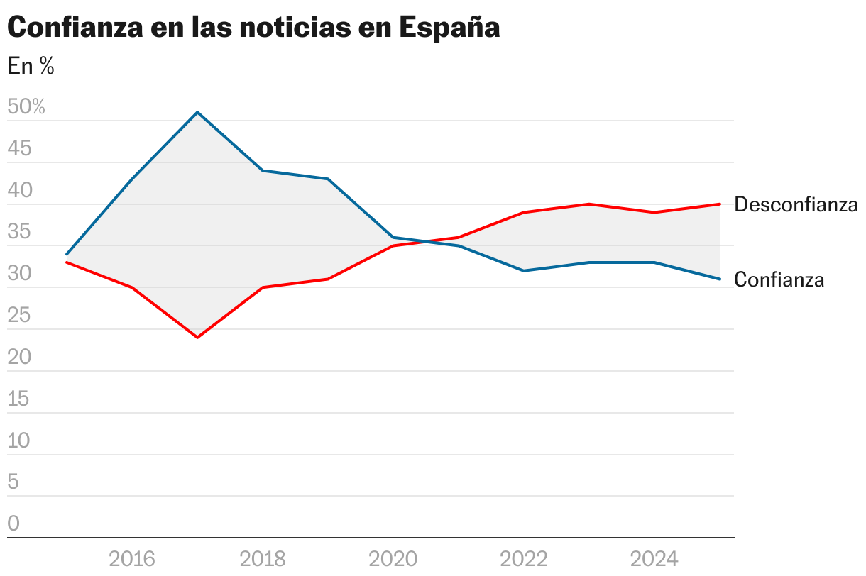El Instituto Reuters para El Estudio del Periodismo publica desde hace más de un decenio su informe anual sobre el consumo de noticias digitales. En todo este tiempo, los investigadores que colaboran con esta institución de la Universidad de Oxford han abordado en sus pesquisas cientos de asuntos relacionados con los desafíos comunicativos de la información. Uno de los más acuciantes es la desinformación que socava las democracias. Y sobre ella inciden las conclusiones del informe para 2025 publicadas durante la madrugada de este martes, que sitúan a los profesionales de la política y a los influencers como las fuentes menos fiables de información veraz. El sentir de la mayoría de los españoles sondeados en el muestreo es que son sus políticos quienes más desinforman.