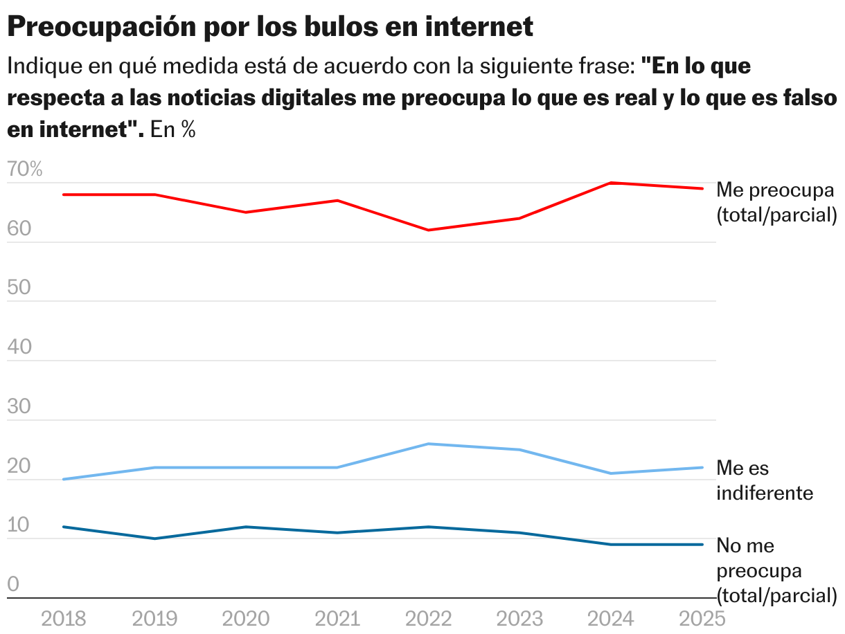 La preocupación por la desinformación destaca en España con un 69% de temerosos por la circulación de bulos en internet, lo que supone ocupar la novena posición global en este ámbito. “Esta inquietud ha crecido en los últimos años, probablemente influida por eventos como las elecciones generales de 2023, las europeas de 2024, la dana que afectó a Valencia en octubre de 2024 y el rápido desarrollo de herramientas de inteligencia artificial capaces de generar contenidos falsos cada vez más realistas”. Y aquí es donde emerge una perspectiva halagüeña hacia los medios de comunicación: “Cuando los españoles sospechan que una información puede ser falsa o engañosa, el 34% recurre a los medios informativos para contrastarla, por encima de las fuentes oficiales (31%), los buscadores (24%), los sitios web de verificación de datos (23%), las redes sociales o de vídeo (10%) o los ‘chatbots’ de inteligencia artificial (6%)”.