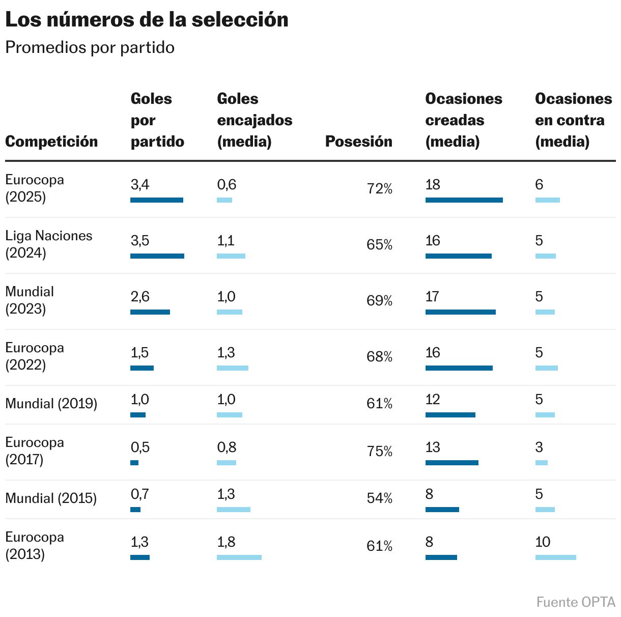 Según datos de Opta, la selección crea en esta Euro más ocasiones, marca más goles, tiene más balón y recibe menos tantos que la de la Eurocopa 2013 y el Mundial 2015, cuando el seleccionador era Ignacio Quereda, y también que la de las Eurocopas 2017 —excepto la posesión— y 2022 y los Mundiales 2019 y 2023, con Vilda al frente. Del combinado que llegó a la semifinal en 1997, cuando el torneo se denominaba Campeonato Femenino de la UEFA y tan solo lo jugaban ocho selecciones, Opta no tiene registros, pero ese equipo tan solo ganó un partido en la fase de grupos —perdió otro y empató otro— antes de estrellarse en el penúltimo escalón ante Italia.