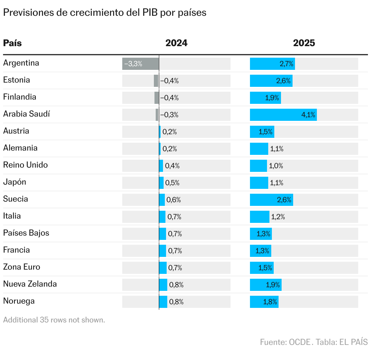 A golpe de actualización, la organización vuelve a dar una buena nota a España respecto al resto de países de la eurozona, que apenas crecerá un 0,7% este año y un 1,5% en 2025 pese a que ambas cifras han sido revisadas al alza en dos décimas respecto al informe de febrero. Los augurios para Alemania son peores: reduce en una décima la estimación de crecimiento para 2024, hasta el 0,2%, y mantiene el 1,1% para el próximo ejercicio. Las perspectivas para Francia también son modestas, aunque mejoran levemente (sube una décima el PIB para este año, hasta el 0,7%, y en dos el que viene, hasta el 1,3%).