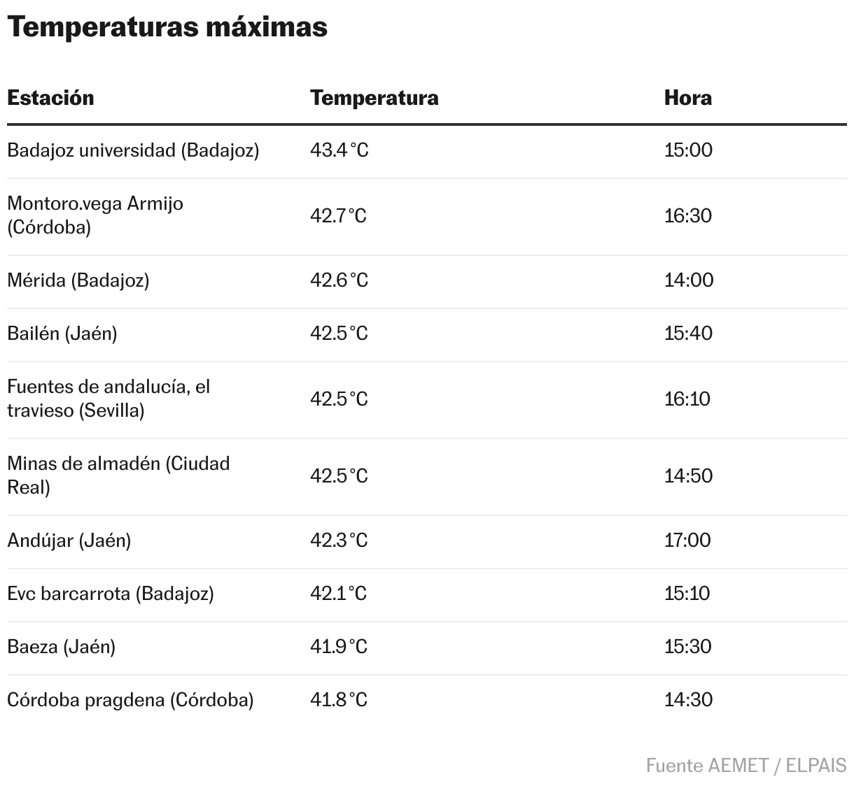 Este domingo, primer día de la ola de calor, ocho estaciones superaron el umbral de los 42°. La más alta de toda España fueron los 43,4° de Badajoz Universidad. Después sigue la estación de Montoro-Vega Armijo, en Córdoba (42,7°); la de Mérida en Badajoz (42,6°); la de Bailén en Jaén, la de Fuentes de Andalucía, El Travieso, en Sevilla, y la de Minas de Almadén en Ciudad Real (todas con 42,5°); la de Andújar en Jaén (42,3°) y la de EVC Bancarrota en Badajoz (42°).