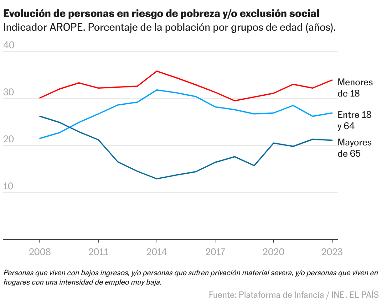 El estudio califica la adolescencia como “la etapa olvidada”, y el director de la Plataforma de Infancia, Ricardo Ibarra, argumenta que “los jóvenes de entre 13 y 17 años son los que suponen un mayor coste de crianza”. De ahí que las familias con menores en esas edades estén casi 10 puntos peor que el conjunto de la población, que presenta una tasa de riesgo de pobreza o exclusión del 26,5%. Este, que se conoce como tasa AROPE, según sus siglas en inglés, es un indicador que mide tres variables: por un lado, la intensidad del empleo en el hogar; por otro, el riesgo de pobreza, que mide cuántas personas tienen ingresos bajos con relación al conjunto de la población (recoge a todos los hogares cuya renta es inferior al 60% de la mediana del país, teniendo en cuenta el tamaño de las familias) y, finalmente, la carencia material severa.