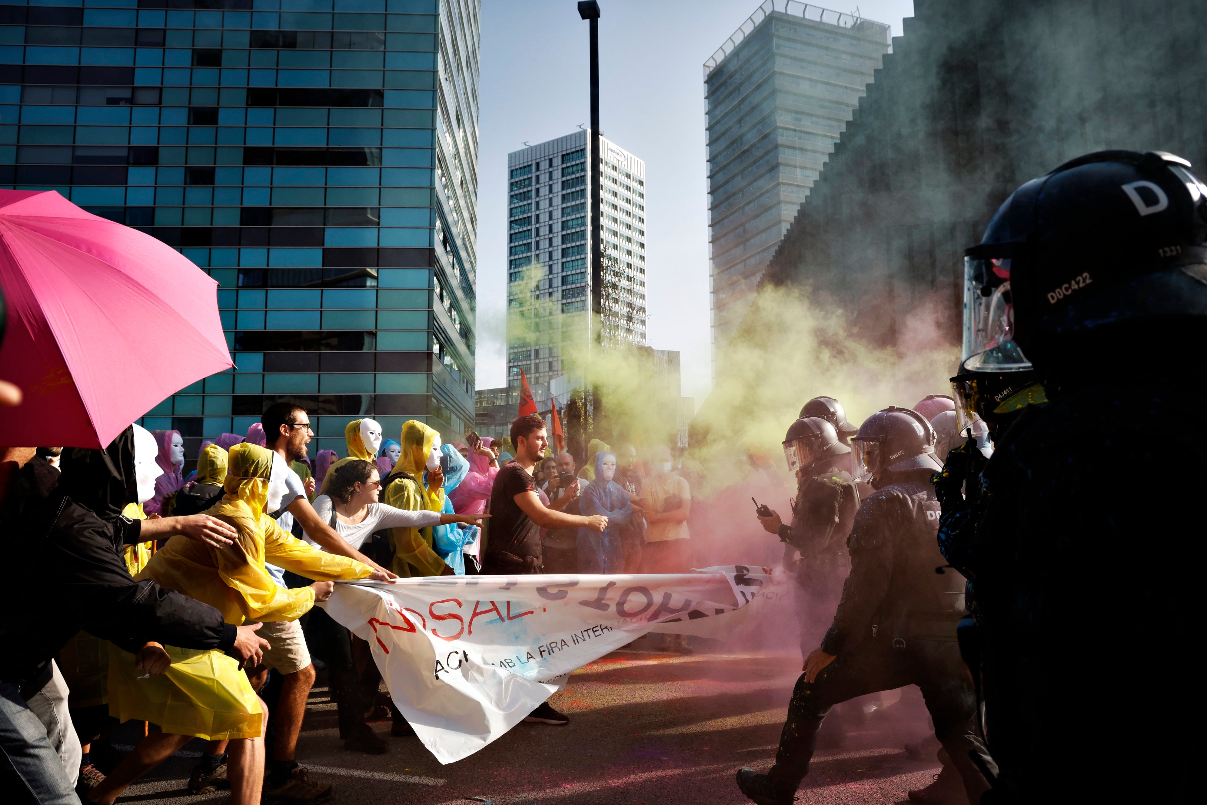 El primer enfrentamiento ocurrió a la salida de la estación de los Ferrocarriles de la Generalitat de la Fira, en donde la policía impidió el paso a los manifestantes, quienes, vestidos con impermeables y máscaras, intentaron salir de la boca del metro para lanzar pintura a los asistentes. Entre pitidos y gritos de “vergüenza”, la policía cargó contra la primera línea de manifestantes que intentaron romper el cordón policial para acceder al lugar en donde supuestamente se encontraban los asistentes a la feria. Una persona resultó herida y fue auxiliada por los paramédicos que se encontraban en el lugar.