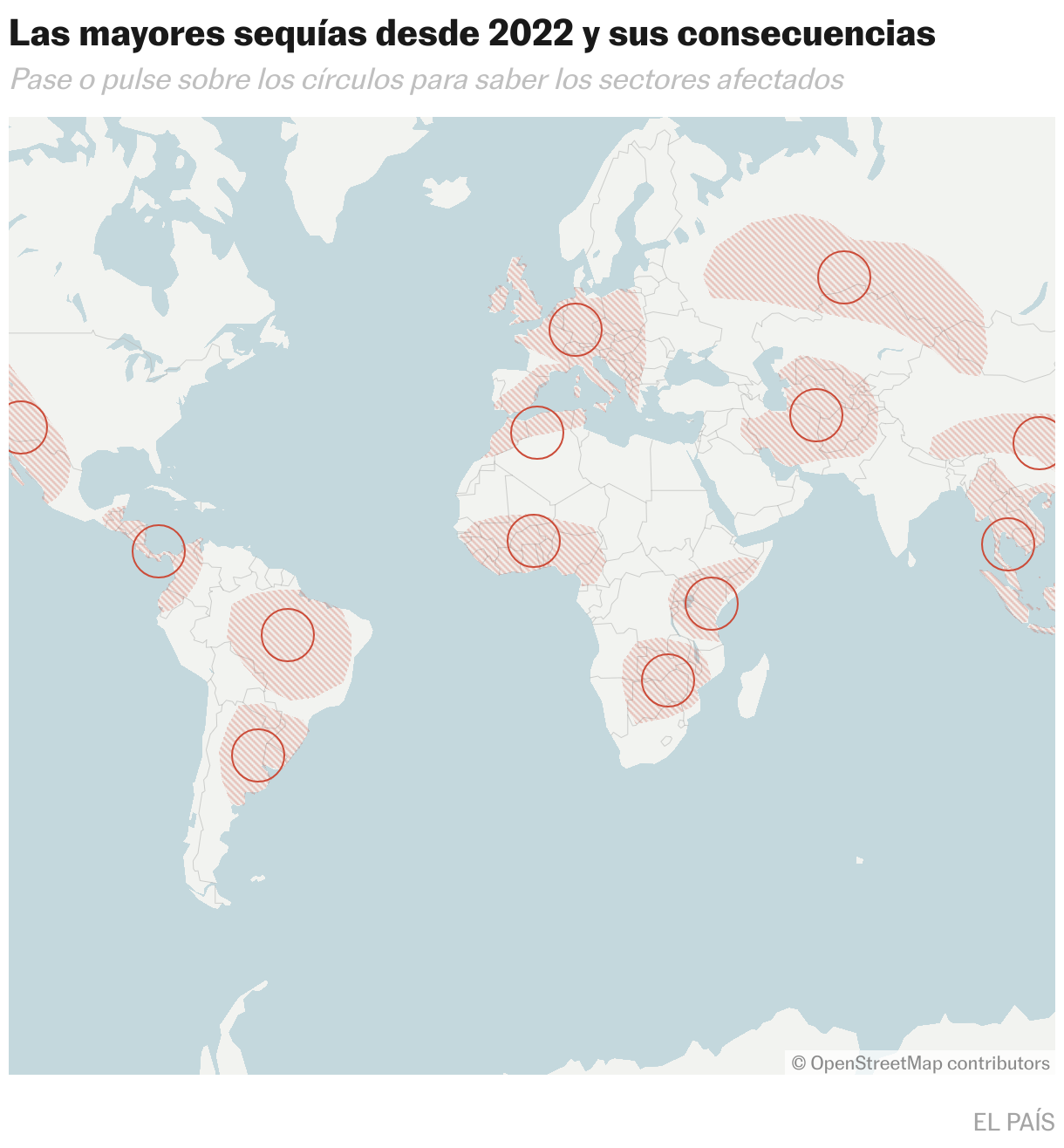 El atlas, elaborado por medio centenar de expertos internacionales para la UNCCD y el Joint Research Centre de la Comisión Europea, resume en cinco puntos los impactos de la sequía más allá de la inseguridad alimentaria, los conflictos, las migraciones, la degradación de la tierra o los precios de los alimentos. El primer punto es el agotamiento del abastecimiento de agua y cómo influye en las luchas por su control, las diarreas o la higiene, especialmente en las mujeres. Prosigue con la agricultura, que precisa de un 70% del agua dulce del mundo y refleja cómo, por ejemplo, los patrones erráticos de lluvia inciden en la supervivencia de los pequeños agricultores. El tercer punto es la potencia hidroeléctrica, que proporciona la mayor cantidad de energía renovable del mundo. Su interrupción puede conllevar falta de inversiones, cortes de luz o aumentos del uso de combustibles fósiles. El cuarto se detiene en la navegación fluvial y cómo la bajada de los niveles de agua puede interferir en el transporte por los más de 600.000 kilómetros navegables del mundo con suspensiones en las cadenas de suministros o en accesos a instalaciones médicas, educativas o laborales. Y el último es la afectación de los ecosistemas y la consecuente pérdida de biodiversidad, la proliferación de insectos o la degradación del suelo, donde se almacena el 80% del carbono global.