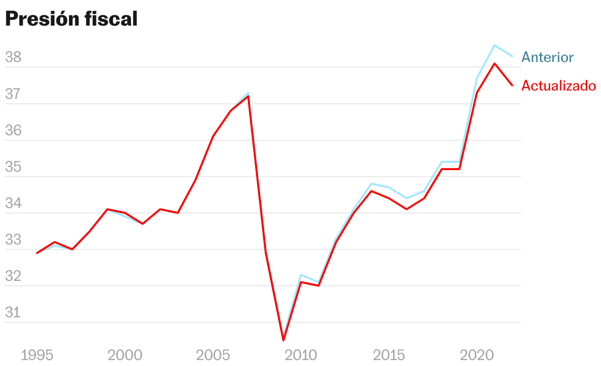 Otro punto positivo a resaltar en cuanto a presión fiscal, apunta Artola. Este indicador, que marca el peso de todos los impuestos —incluidas las cotizaciones sociales— sobre el PIB, no debe seguir ninguna pauta ni alcanzar un objetivo concreto, pero sí ayuda a mostrar cuál es el pulso de la política tributaria de un país. En 2022, cuando el INE no tenía tomado el pulso real de la economía, la presión fiscal se acercó al 39%. Ahora, tras la revisión, todo apunta a que cerrará 2023 por debajo del 36%. Es algo, recuerda Artola, que da margen al Gobierno en cuestión impositiva, máxime cuando aleja de nuevo a España de la media comunitaria, que ronda el 41%.