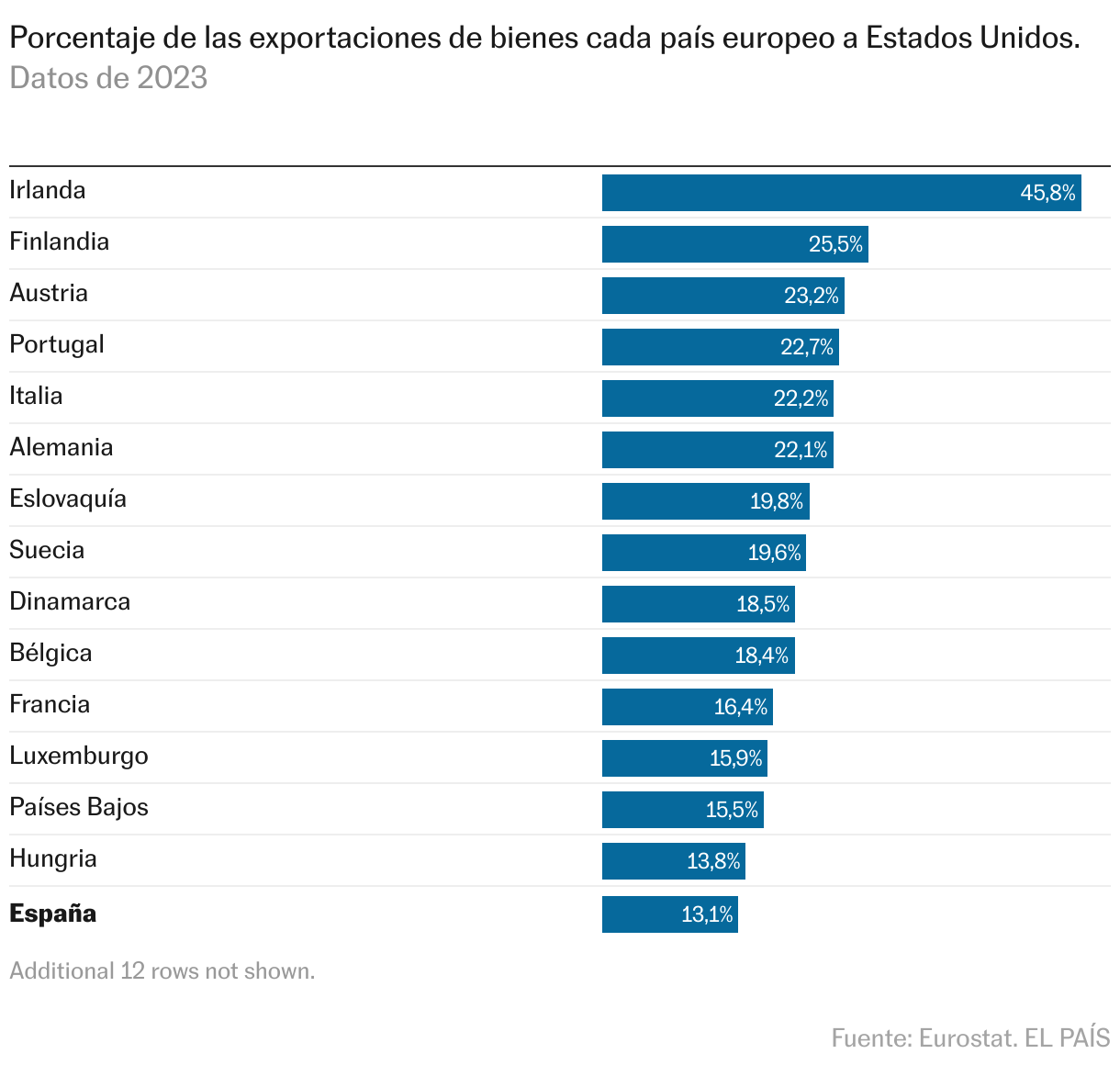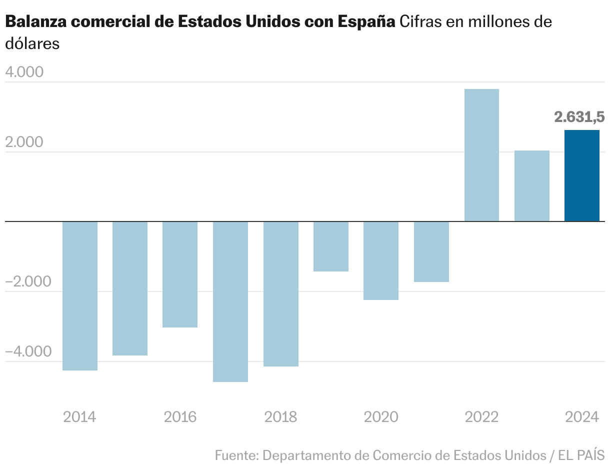 A esto se suma la promesa hecha esta semana de imponer a la Unión Europea aranceles como respuesta al (IVA), que Washington interpreta como una barrera comercial. De concretarse, estos nuevos aranceles no tendrían un impacto macroeconómico mayúsculo, pero a nivel sectorial podría variar enormemente ―dependiendo de los tipos actuales―, y se reflejaría en el mercado de valores. Al respecto el banco suizo Safra Sarasin precisa que mientras que los Veintisiete imponen un arancel del 10% a los coches estadounidenses, del otro lado solo se aplica un 2,5% a los europeos. Por lo tanto, de homologarse, el sector automotriz europeo sangraría. A nivel nacional, el sector también saldría perjudicado. Mínguez explica que “en el caso de la automoción, España ya mantiene un déficit estructural con EE UU, por lo que unas tasas adicionales podrían agrandar este desbalance”.
