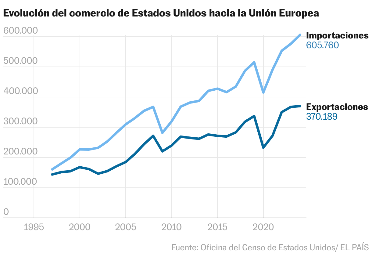 Los datos del comercio bilateral entre EE UU y la Unión Europea reflejan la persistente paradoja que ha marcado la estrategia proteccionista de Trump: cerrar el déficit comercial que aqueja al país es una meta esquiva. Durante su primer mandato, a pesar de las medidas proteccionistas, la tasa se fue ampliando año a año respecto al nivel que registraba previo a su llegada a la Casa Blanca. En concreto, el país paso de un déficit de 151.575 millones de dólares en 2017 a uno de 182.579 millones en 2020. Luego, bajo la presidencia de Joe Biden, el desfase se amplió hasta alcanzar niveles récord en 2024 con 235.571 millones de dólares, impulsado por una mayor demanda de productos europeos, y también del resto del mundo, donde la dinámica ha sido la misma.
