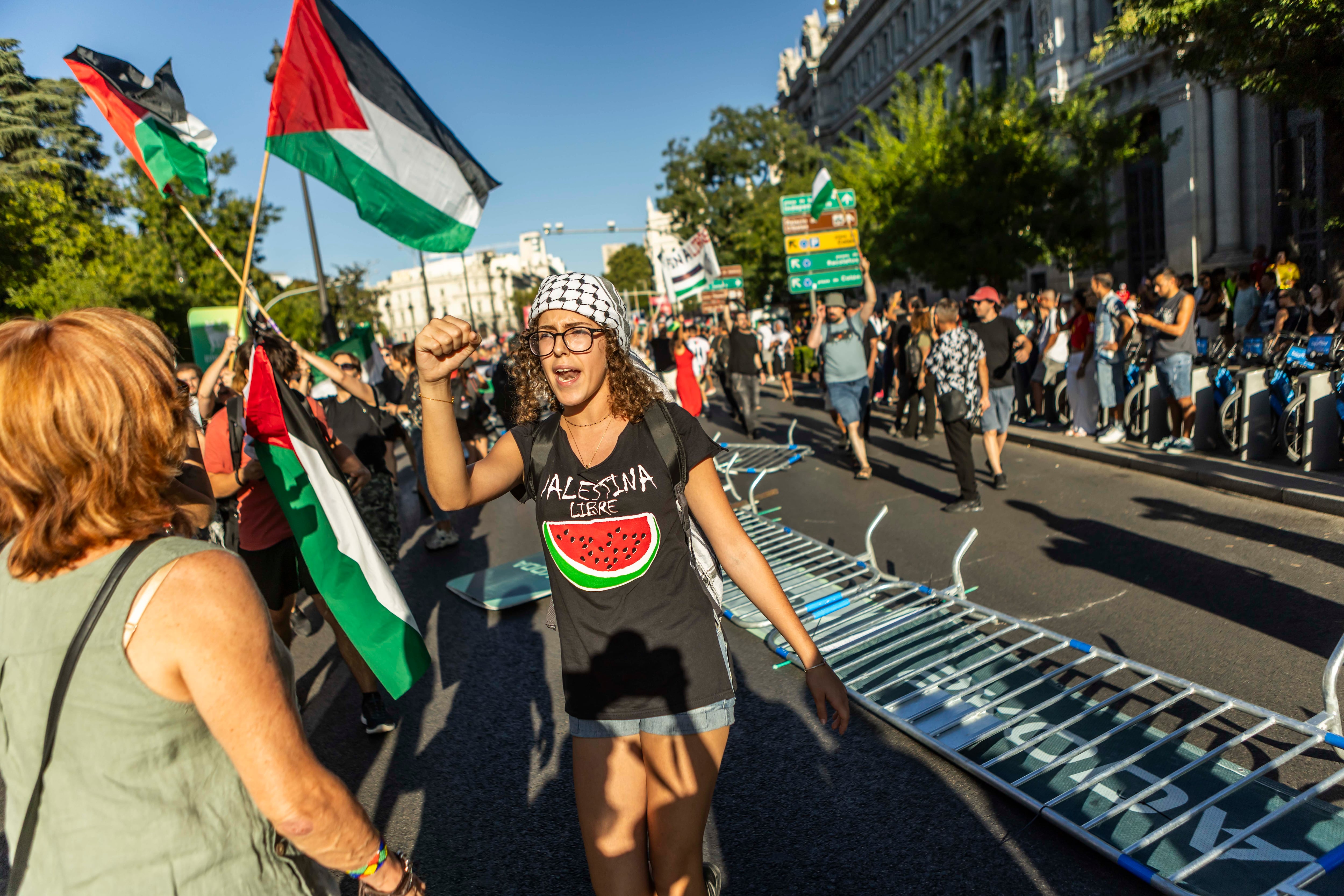En la parada de metro del Banco de España, una agente de Policía se sube a un bordillo y graba con su móvil a los manifestantes cantando. Del metro salen un par de chicos con camisetas antiguas del Real Murcia, uno de ellos dice riendo: “Pero qué es eso de que la Vuelta patrocina a Israel”. En ese momento la organización, que ha instalado en Cibeles el podio, pincha Si antes te hubiera conocido, de Karol G, y la letra se mezcla con los cánticos de denuncia. El 7 de octubre de 2023, los terroristas palestinos de Hamás mataron a 1.200 víctimas israelíes y secuestraron a 251. La reacción de Israel se ha saldado, según cifras de UNICEF, en 14.500 niños asesinados en Gaza (unos 23.000 heridos) y 64.000 palestinos muertos, además de la destrucción de ciudades, asesinatos de trabajadores humanitarios y periodistas, y bloqueo de alimentos y medicamentos. La Vuelta a España, un espectáculo deportivo global (una de las tres grandes carreras ciclistas de tres semanas en el mundo), fue elegida por manifestantes propalestinos para denunciar al mundo lo que muchos expertos, no hay unanimidad, califican como genocidio. ¿La razón? La presencia de un equipo, el Israel-Premier Tech, propiedad de un magnate israelí que apoya la política de exterminio de Netanyahu. “La culpa”, dice una mujer de Barcelona acompañada de dos amigas, “es de quien permite competir a un equipo que solo pretende blanquear el genocidio con su presencia y decir que nada pasa. Pues pasa y mucho, y estamos orgullosas de señalarlo y denunciarlo, y de que se pare la carrera y se entere todo el mundo”.
