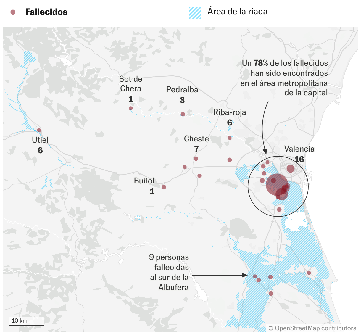 De acuerdo con los datos provisionales del CID, órgano técnico formado por forenses y fuerzas de seguridad del Estado, un total de 16 víctimas fueron encontradas en la carretera o en coche. Es muy probable, no obstante, que otras fueran sorprendidas en su vehículo y la corriente acabara arrastrándolas mucho más lejos. El recorrido que hicieron algunos de los cuerpos la tarde noche de la dana constituye otro elemento estremecedor de la tragedia. Un cadáver hallado en el parque natural de la Albufera, por ejemplo, pertenecía a una persona desaparecida en Chiva, 30 kilómetros más arriba.
