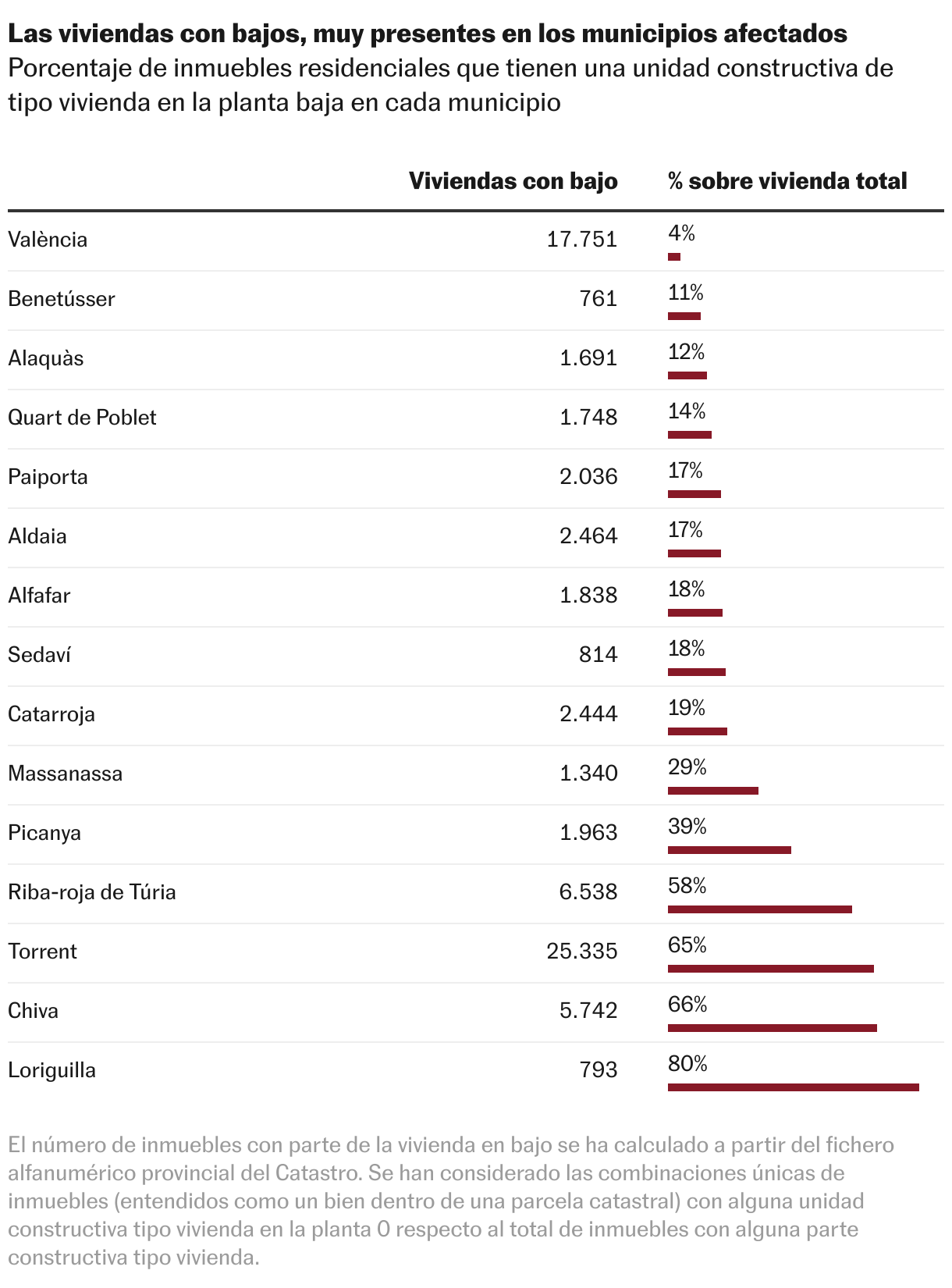 Según el análisis realizado por este periódico basado en el fichero alfanumérico del Catastro, dentro de los municipios valencianos más afectados por la dana, el 66% de los inmuebles de Chiva (lo que supone 5.742) incluyen una vivienda en la planta baja del edificio. Un porcentaje que alcanza el 65% en Torrent (25.335); el 39% en Picanya (1.963); el 29% en Massanassa (1.349); el 19% en Catarroja (2.444); el 18% en Sedaví (814); el 18% en Alfafar (1.838); el 17% en Aldaia (2.464); el 17% en Paiporta (2.036); el 11% en Benetússer (761), y un 4% en la ciudad de Valencia (17.751), si bien en esta última solo se vieron afectadas por el temporal sus pedanías del sur, La Torre, Castellar y Forn d’Alcedo.