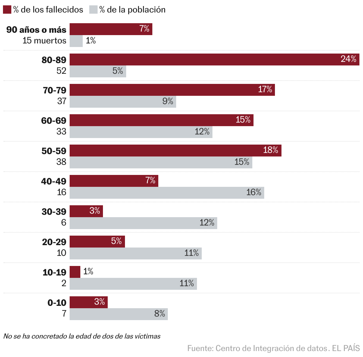 Las casas y los garajes fueron las principales trampas mortales para las víctimas de la devastadora dana que asoló la provincia de Valencia el 29 de octubre. 103 cuerpos sin vida sobre un total de 218 fallecidos fueron hallados en las plantas bajas de las viviendas (68) y en los aparcamientos y sótanos (35), según los registros provisionales del Centro de Integración de Datos (CID). La violenta tromba de agua afectó a numerosas localidades que conservan en su trama urbana casas tradicionales de pueblo en las que las plantas bajas se utilizan como vivienda, y quedaron arrasadas, al igual que buena parte de los comercios. El mayor porcentaje de fallecidos (un 24%) se hallaban en la franja de edad de 80 a 89 años, que suele corresponderse con problemas de movilidad, una de las razones por las que vivían a pie de calle. Casi la mitad de las víctimas tenían más de 70 años.