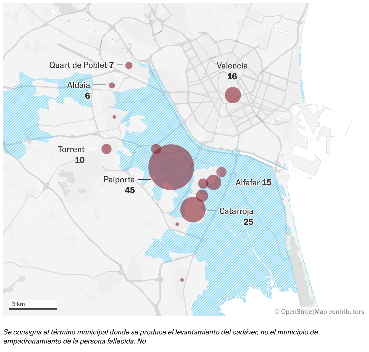 La relación de los lugares donde fueron hallados los cadáveres permite reconstruir una catástrofe de magnitudes gigantescas. 26 fallecidos fueron encontrados en plena calle y otros tantos en los campos. 16 cadáveres fueron levantados dentro de vehículos o en las carreteras; 11 en residencias; cuatro en barrancos, ramblas y hospitales (en los que fallecieron tras haber ingresado aún con vida); tres en polígonos industriales, los mismos que en playas (El Saler, Pinedo, y Sueca), en árboles o en acequias; dos en postes de teléfonos, en ascensores, y en vías del tren, y otro de ellos en el cuartel de la Guardia Civil de Paiporta.