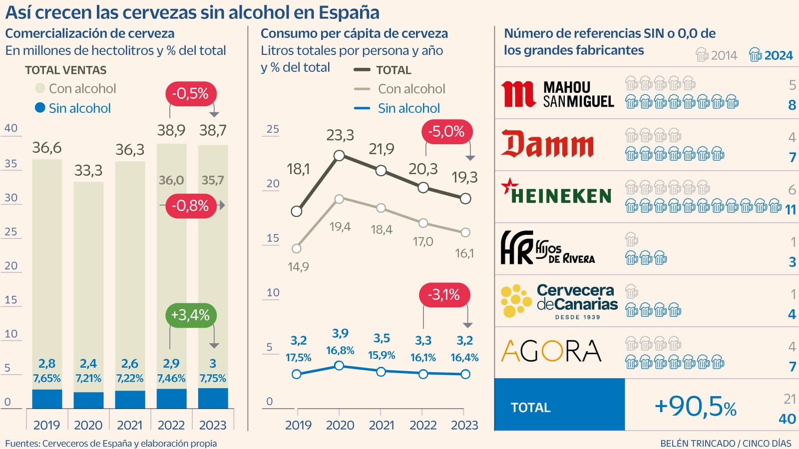 En 2023, las ventas totales de cerveza alcanzaron los 38,7 millones de hectolitros en el mercado nacional, una cifra que representa una contracción anual del 0,5%, según los datos de la patronal Cerveceros de España. Por contra, las cervezas libres de alcohol crecieron un 3,4%, alcanzando los tres millones de hectolitros por primera vez desde que la asociación desglosa sus cifras. Esto implica que, en 2023, casi el 8% de lo producido correspondió a las referencias libres de alcohol.
