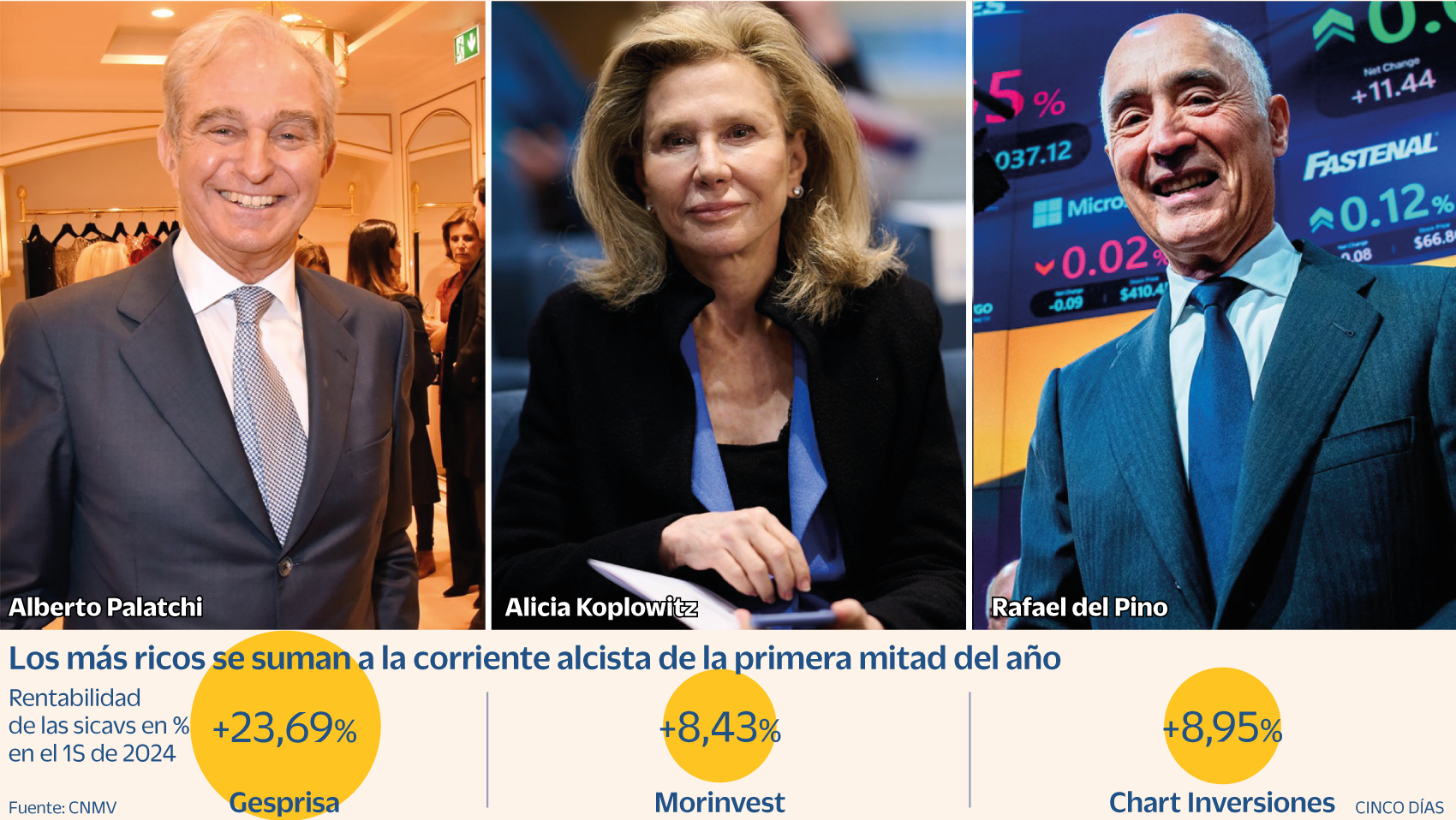 Las grandes fortunas españolas se han sumado al frenesí del mercado por las grandes tecnológicas y los fármacos contra la obesidad, dos de las tendencias que han marcado el comportamiento de la Bolsa en los primeros seis meses del año. Entre todas las denostadas sociedades de inversión colectiva de capital variable (sicavs) de los grandes inversores patrios, aquellas que han logrado arañar mayores rentabilidades en el arranque de 2024 y batir al Ibex 35 destacan las que se subieron a la ola de los tratamientos para la pérdida de peso, en donde la compañía estadounidense Eli Lilly y la danesa Novo Nordisk son las abanderadas. Dentro de este grupo se engloban Gesprisa, la sicav de Alberto Palatchi, fundador de Pronovias, y Swift Inversiones, el vehículo de Leopoldo del Pino, que han logrado rentabilidades del 23,7% y del 13,4%.