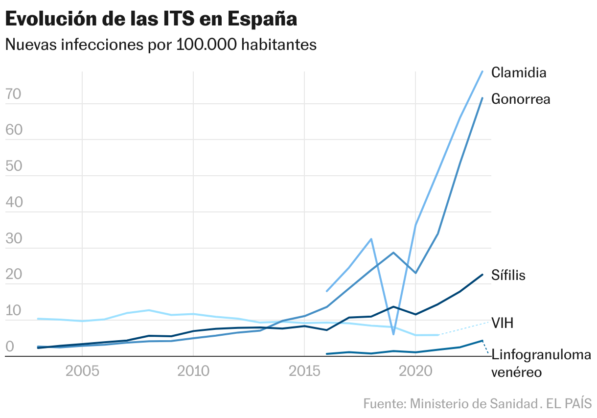 También crecen otras ITS que incluye el informe: la clamidia (Chlamydia trachomatis) y el linfogranuloma venéreo, cuyo seguimiento es más reciente y no lo hacen todas las comunidades autónomas. Este informe no mide el VIH que, por el contrario, sigue una tendencia descendente en los últimos años.