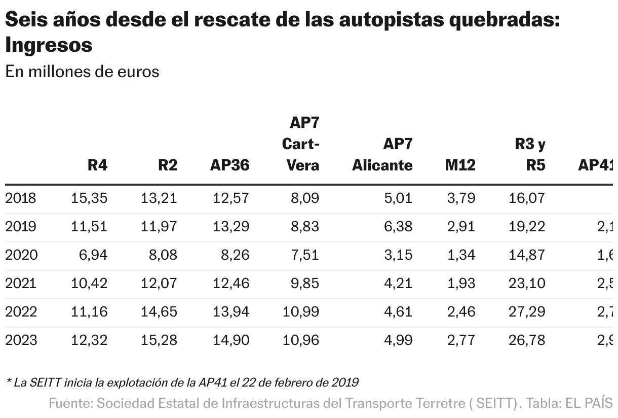 En los seis primeros años de gestión pública (2018-2023) los ingresos totales de las madrileñas R-2, R-3, R-4, R-5, M-12 (Eje Aeropuerto) y AP-41 (Madrid-Toledo), de la AP7 Cartagena-Vera, la circunvalación de Alicante, y la AP-36 (Ocaña-La Roda), suman 457 millones de euros, para un resultado de explotación de 98 millones y un resultado neto de 73 millones. El margen operativo del 21% es exiguo frente a rendimientos superiores al 70% que obtienen otras autopistas en España.
