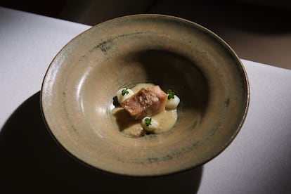 Esa mirada a Oriente no interfiere el verdadero homenaje que rinde la carta, al de las tradiciones gastronómicas de Mallorca bajo un prisma moderno. Aleix Serra, nacido en el seno de una familia muy ligada a las costumbres de la isla, lo tenía un poco más fácil. “Desde pequeño he vivido momentos como las matanzas, todo un ritual de encuentro y de respeto por el producto en nuestras familias”. De ahí surge la idea de acompañar con sobrasada casera —además de cremoso de hinojo silvestre y aceite picual de la Finca Sa Cadernera— su pan de olla con harina de algarroba, típico de la isla, en Obrador. Este pase se cuela a mitad del menú, para no engañar al estómago al comienzo e integrarse como una parte más de la carta.