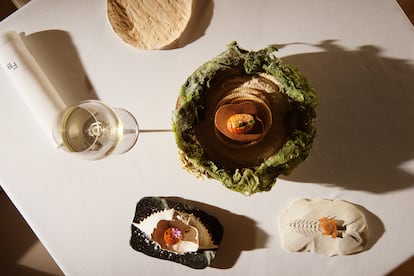 Esta puesta en valor del kilómetro 0 se paladea ya en el arranque “verde” de ambos menús, con elaboraciones como el guisante a la brasa, su alcachofa en doble cocción o una escalivada para los meses más cálidos a base de patata, judía berenjena, los tomates cherry o el pimiento rojo. Un plato que hermanda a todo el equipo bajo la brisa del Mediterráneo. “La escalivada es una tradición compartida entre Cataluña y Mallorca desde siempre”, comentan. La caída de la hoja trae sabores más terrenales y profundos a su carta, con el aprovechamiento de la calabaza, el girasol o sorprendentes combinaciones de sabor como el pase de remolacha, chocolate y queso. “Esa temporalidad nos garantiza no solo la frescura y el sabor óptimo de cada ingrediente, sino también respetar los ritmos de la naturaleza y reducir la huella ambiental, dos objetivos clave de nuestro plan Projecte Zero, que iniciamos en 2023”.