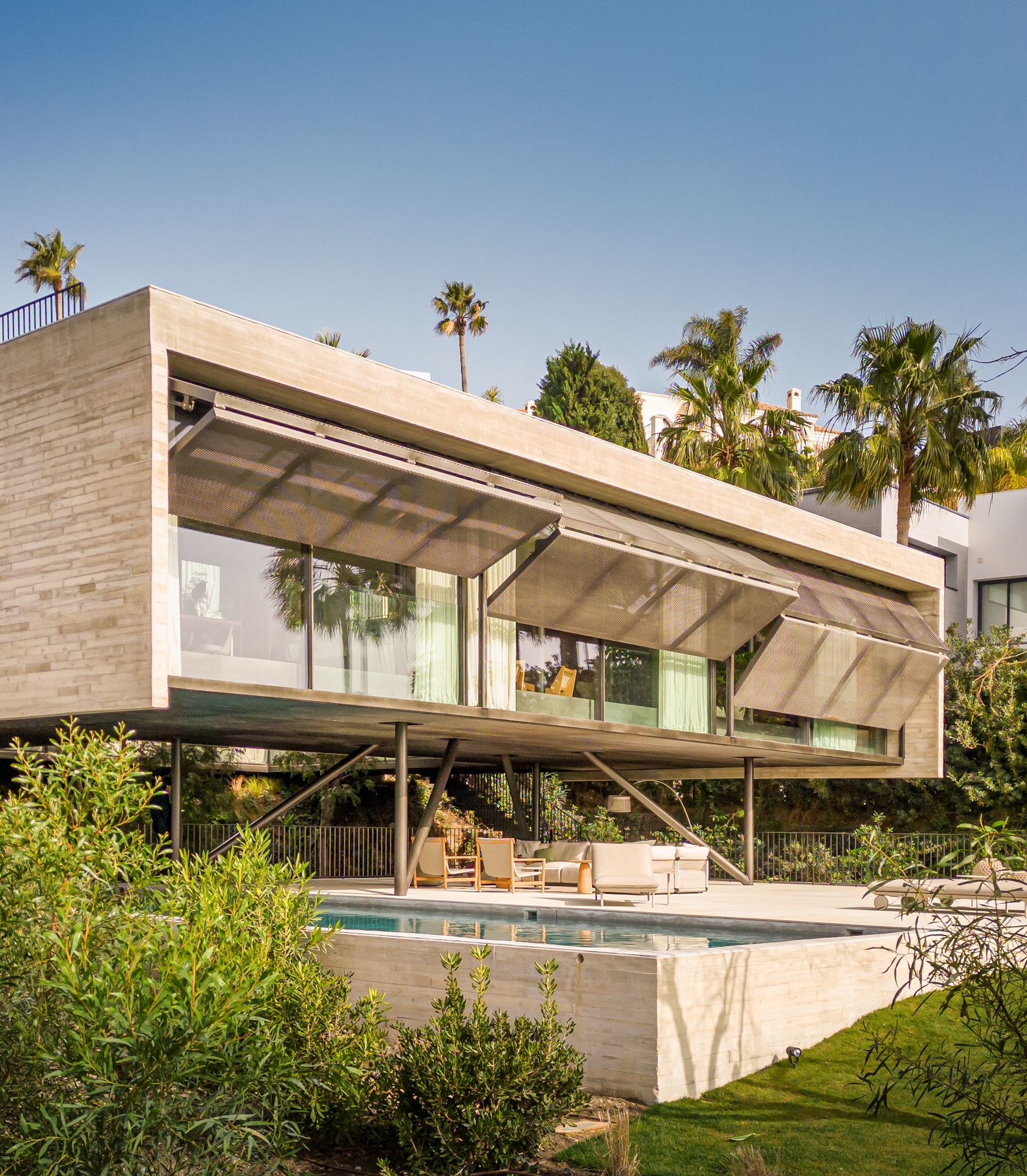 Unos pilotes sustentan un volumen limpio que gira en torno a un patio central, que actúa como pulmón de la casa y que se abre al jardín interior. Este elemento diferenciador permite vistas cruzadas y conecta el interior con el mar Mediterráneo y a un campo de golf en la localidad malagueña de Benahavís, en la Costa del Sol. La vivienda, de diseño depurado y que busca la integración con el paisaje, distribuye su espacio en cinco dormitorios y cuatro baños, comedor, salón, cocina totalmente equipada, habitación de invitados, trastero, gimnasio y sala de cine, entre otras estancias. Además dispone de 742 metros cuadrados de terrazas y un aparcamiento con capacidad para tres vehículos.