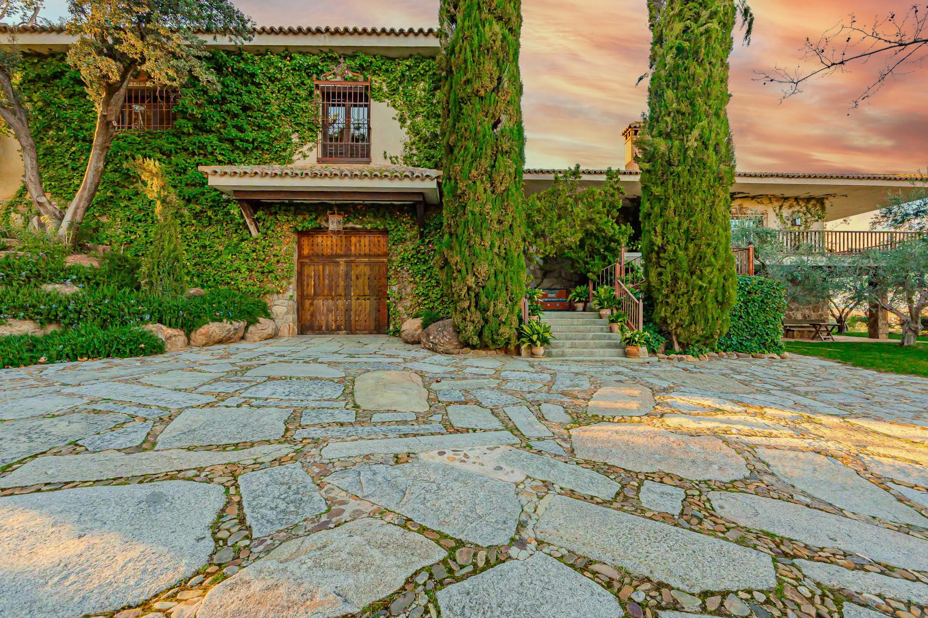 Historia, tradición y naturaleza se dan la mano en este cigarral que disfruta de vistas panorámicas sobre Toledo. La finca señorial de recreo suma 1.597 metros de superficie construida y se dispone en dos alturas adaptadas al terreno, en pendiente. El portón de entrada, de madera y hierro, es original del siglo XVIII y el solado del largo camino es de canto rodado y grandes piedras. Al entrar, la mirada queda fijada en el patio inspirado en el Patio de los Leones y el Salón de Embajadores de la Alhambra de Granada.