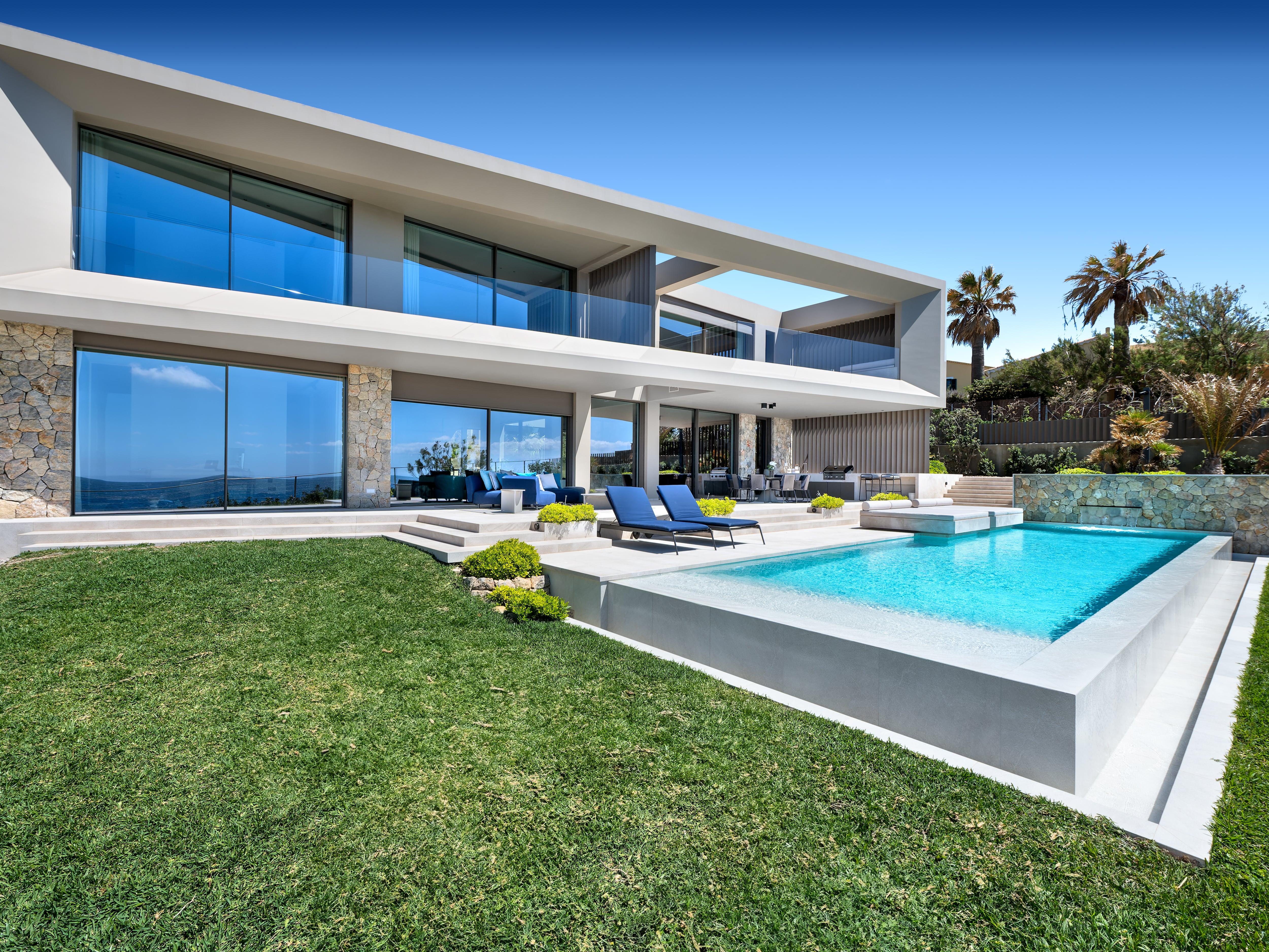 Su nombre es Villa Goya, es de nueva construcción y acaba de salir al mercado por 28 millones de euros. Se trata de una mansión de factura contemporánea situada en primera línea de mar en el suroeste de la isla balear de Mallorca, en concreto en la zona residencial de Nova Santa Ponsa. Una distintiva fachada lineal; paneles de vidrio de suelo a techo que inundan de luz y proporcionan una sensación de espacio infinito; transición perfecta entre las áreas interiores y exteriores y materiales naturales como la piedra y la madera son algunas de las claves del diseño de esta casa. Un patio interior, elemento tradicional de la arquitectura mediterránea, permite una ventilación natural y aglutina las dos plantas, que están comunicadas por un ascensor.