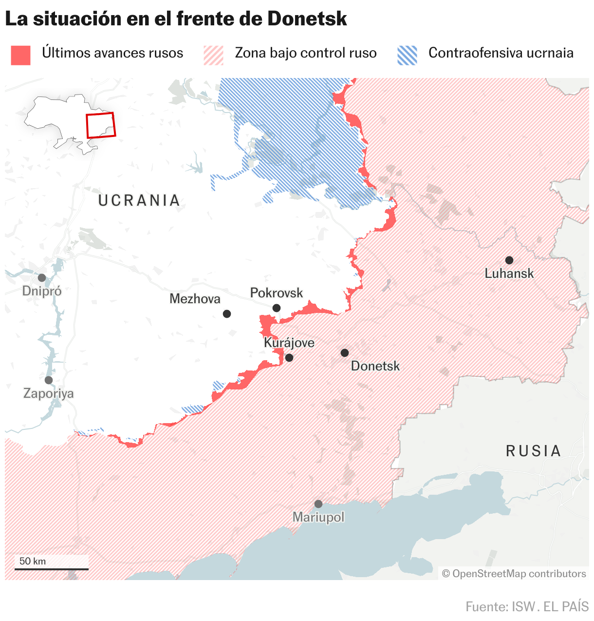 En la granja donde vive Root, media docena de uniformados comparten impresiones al calor de la estufa —fuera, la temperatura es de un grado— acerca del frente que defienden en las inmediaciones de Velika Novosilka, municipio que también ha caído este año en manos rusas. El estadounidense Instituto para el Estudio de la Guerra (ISW) señaló que el Kremlin está redistribuyendo sus unidades desde Kurájove y desplegando fuerzas adicionales sobre Pokrovsk.