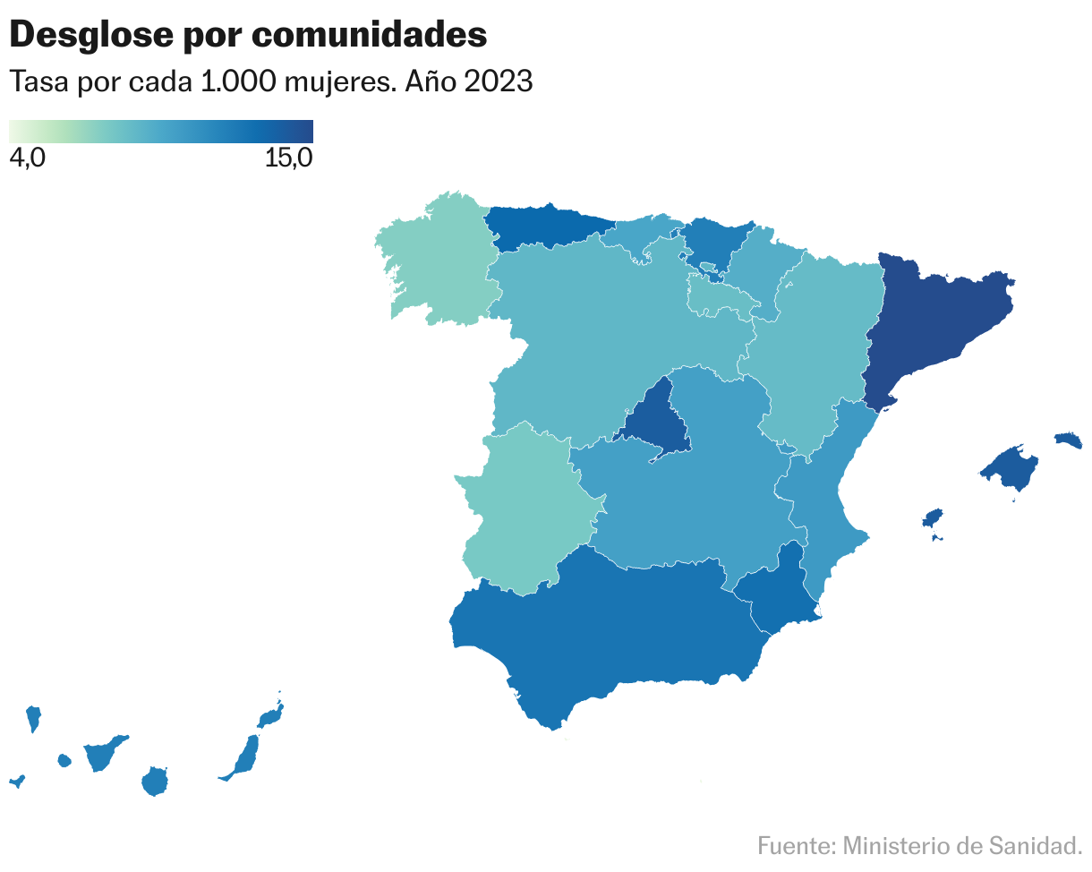 Las diferencias territoriales son notables. Cataluña es la comunidad con mayor tasa (14,92), seguida por la Comunidad de Madrid (13,92). A la cola están Galicia (con 7,3 IVE por cada 1.000 mujeres en edad fértil, menos de la mitad que Cataluña) y Extremadura (7,6).