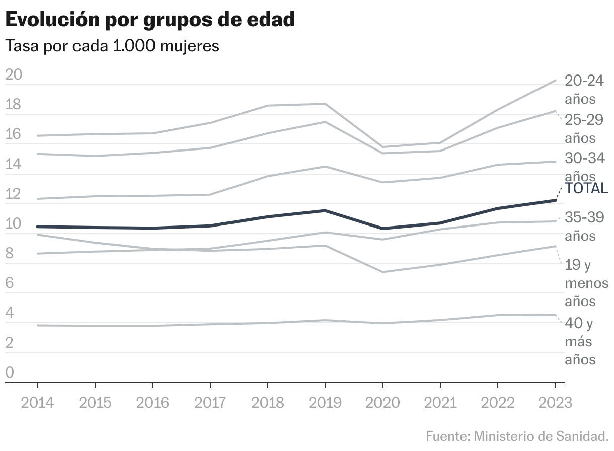 Con respecto a la edad: la subida de las interrupciones ha sido generalizada en todas las franjas. Si se atiende a la tasa, el mayor crecimiento se produjo entre las de 20 a 24 años (10,7%), seguidas de las menores de 20 (7%), entre las que están las adolescentes que ahora no tienen que rendir cuentas a sus familias. Sin embargo, en 2014, 2015 y 2019 la tasa de IVE fue mayor en estas edades.