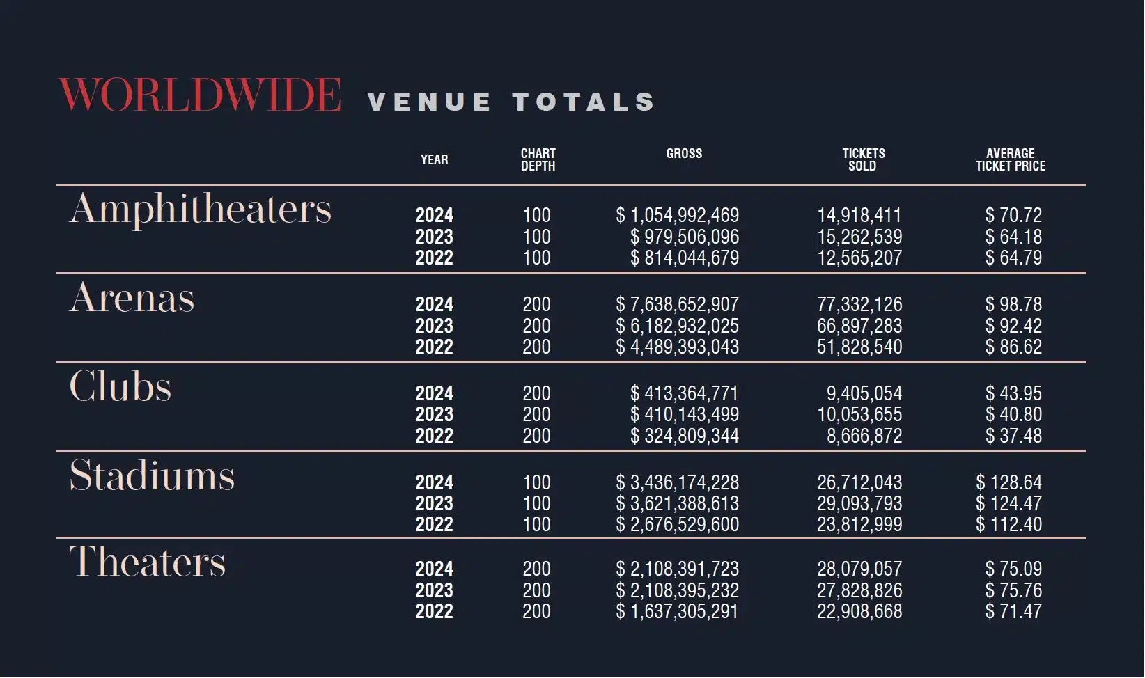Otro dato que no podemos pasar por alto es el de las arenas o grandes pabellones, verdaderos pilares de la música en directo. Han superado la barrera de los 7.6 mil millones de dólares en ingresos, vendiendo la increíble cantidad de 77 millones de entradas, y con un precio promedio por entrada que se ha disparado a $98.78. Este crecimiento con respecto a 2022 es, sencillamente, espectacular. Entonces rondaban los 86 dólares por ticket.