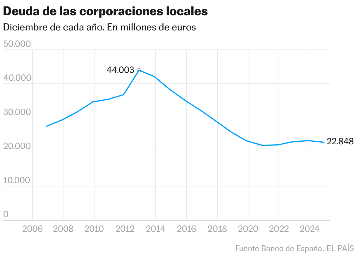 Con estos mimbres, el conjunto de corporaciones locales fue rebajando año tras año sus números rojos. Una senda que se mantuvo durante casi una década, hasta la llegada de la covid-19. En 2021, la deuda municipal subió por primera vez desde el récord alcanzado en 2012, y en los dos años sucesivos siguió creciendo en su conjunto —si solo se consideran los ayuntamientos, que tienen en sus manos el grueso de la deuda, el monto no subió hasta 2022—, aunque a tasas moderadas.