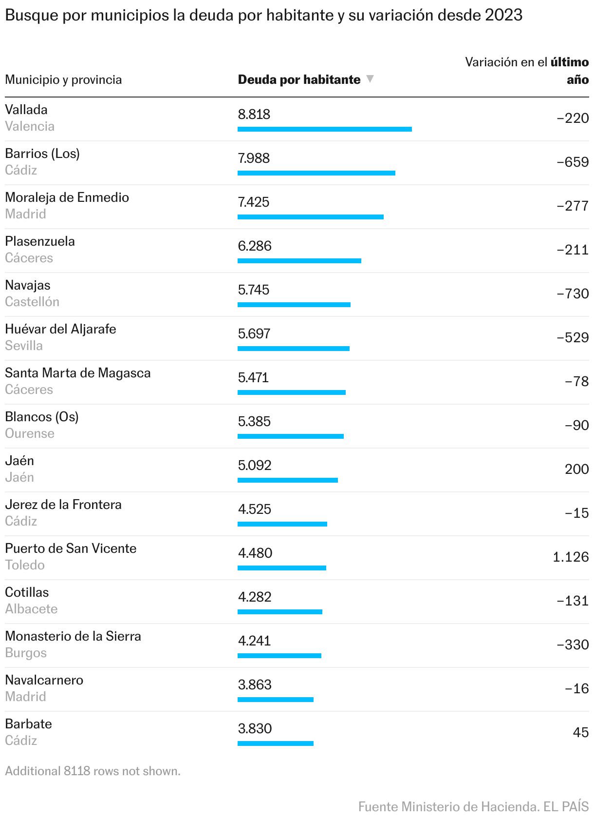 Los Barrios, en Cádiz, tiene la segunda deuda por vecino más elevada: 7.988 euros, según los datos de Hacienda. Al igual que Vallada, suele ocupar las primeras posiciones en la lista de los municipios más endeudados y también ha reducido su pasivo per cápita en comparación con 2023, en 659 euros. Una situación parecida es la de Moraleja de Enmedio (Madrid): es la tercera localidad con más pasivo por habitante, 7.425 euros, pero ha reducido la carga en 277 euros por cabeza.