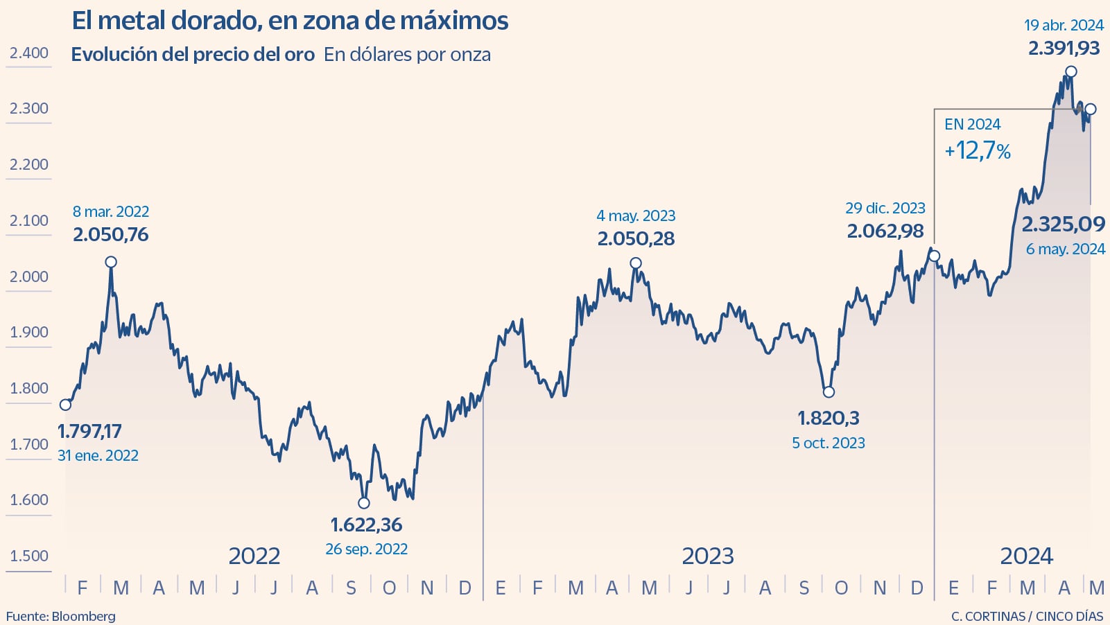 El oro no ha dejado de marcar récord tras récord desde que la Fed comenzase la senda global de subidas de tipos hace ya más de dos años. Esto, y unas expectativas de un precio del dinero más alto durante más tiempo, tendrían que haber impactado a la baja en el precio del metal dorado, que se suele comportar de forma inversa a la rentabilidad de los bonos. Ha dado igual. Y los responsables son, en buena parte, los que deciden sobre esos tipos: los banqueros centrales, azuzados por la inestabilidad mundial, se han lanzado a la compra de oro en los últimos meses, hasta llevar su demanda a máximos históricos, de acuerdo con el informe trimestral publicado por el Consejo Mundial del Oro la semana pasada. El metal precioso ya se revaloriza más de un 12% en lo que va de año, hasta los 2.325 dólares por onza.