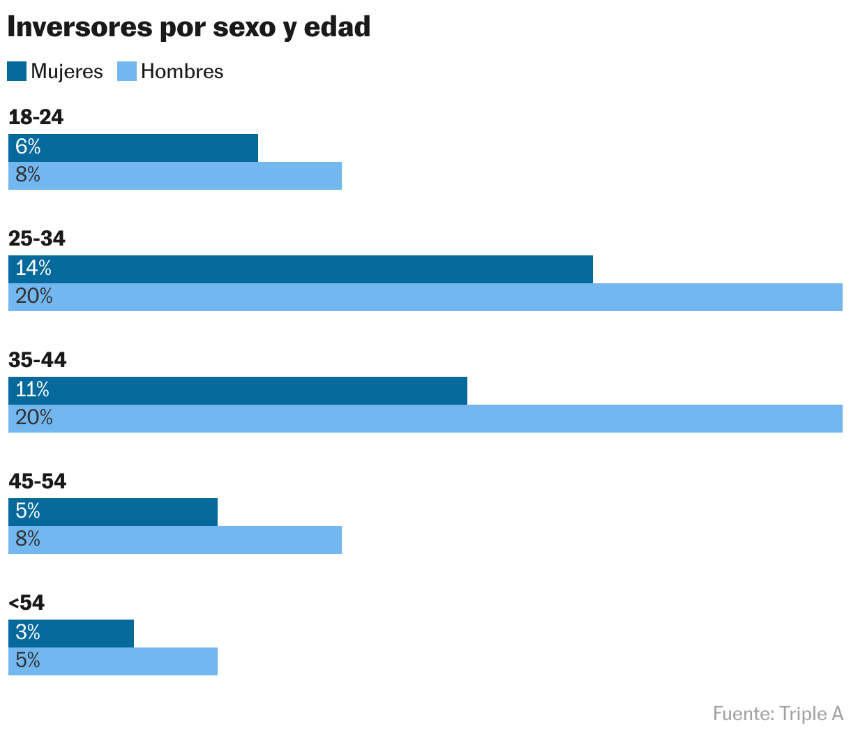 Un fenómeno similar se repite también entre los pequeños inversores, donde los hombres aún son mayoría. A nivel global, el proveedor de pagos con criptomonedas Triple-A estima que el 61% de los inversores en activos digitales son varones y el 39% mujeres, según su informe The State of Global Cryptocurrency Ownership publicado en mayo de 2024. Además, ellos suelen superar a las inversoras en cada franja de edad analizada, entre los 18 y más de 54 años. En España, de acuerdo con el unicornio fintech Bitpanda, las mujeres apenas representan el 30% de sus clientes. El exchange Bitget incluso sitúa esa representación un escalón más abajo: una encuesta realizada en marzo de 2024 apunta que el 84,5% de quienes invierten en criptoactivos son hombres.