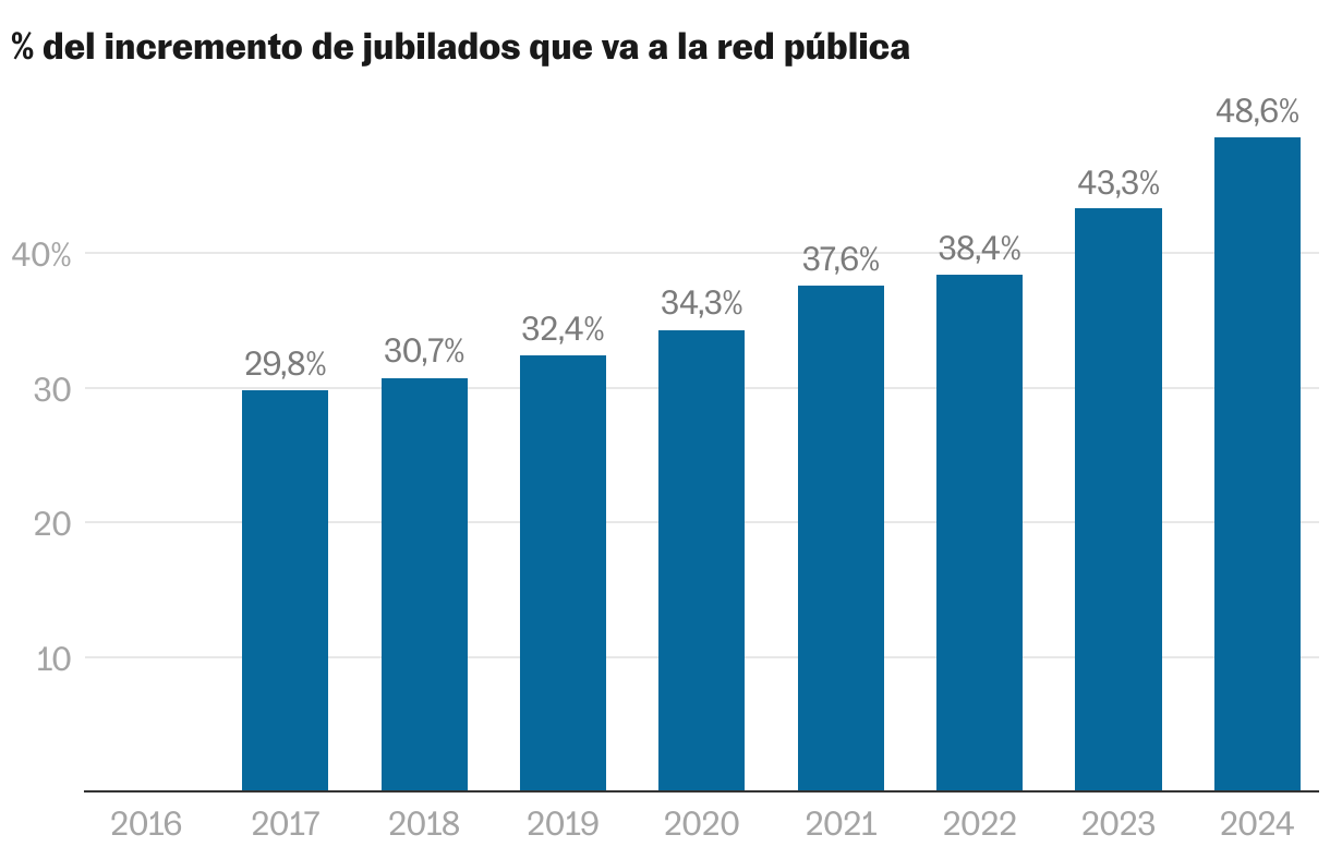 Juan Abarca, presidente de la Fundación IDIS, apunta también otras razones. “Los docentes están dispersos por todo el territorio nacional y, en algunas provincias, la oferta de la sanidad privada no es tan completa como en las grandes ciudades. Esto puede hacer que estos empleados públicos elijan la pública. En las grandes capitales, al contrario, es más frecuente que la gente de esa edad ya tenga un seguro médico privado complementario y prefiera mantener la doble cobertura”, explica.