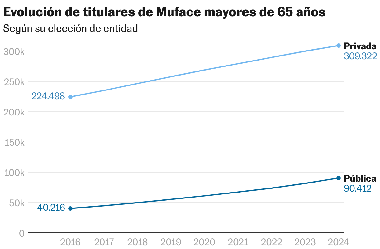 Los datos de beneficiarios mayores de 65 años corroboran esta hipótesis, que vendría a aligerar algo las maltrechas cuentas de los seguros privados con Muface. Si en 2016 solo el 15,2% de los beneficiarios mayores de 65 años elegía la red pública, este porcentaje ya es actualmente del 22,6%. Si se tienen en cuenta cómo se distribuye entre la sanidad privada y la pública el incremento del grupo de los mayores de 65 años, esa tendencia se observa más claramente. Desde 2016, los mayores de 65 años crecen a un ritmo de 10.000 u 11.000 personas al año. Ese año, menos del 30% iba a la pública. Ahora ya lo hace prácticamente la mitad.