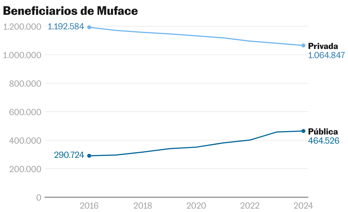 Las empresas y los sindicatos del sector acusan al Gobierno de no financiar adecuadamente a este colectivo, que en el caso de Muface atiende a 1,52 millones de empleados públicos y sus familias, según datos de la mutualidad a los que ha tenido acceso EL PAÍS. A diferencia del resto de la población, que tiene derecho a la sanidad pública, los beneficiarios de Muface tienen una segunda opción: ir a la sanidad privada. Además, cada año pueden escoger qué tipo de asistencia quieren, sin que nada les impida volver a la privada después de ir un año a la pública o a la inversa.