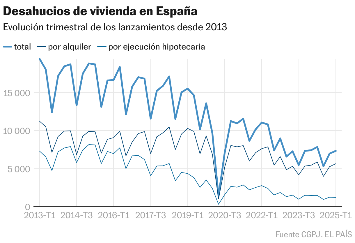 Todo esto ha provocado que haya sido más difícil rebajar el volumen de desahucios derivados de impagos de alquiler. Han retrocedido con respecto a los primeros años de la estadística judicial, porque también las condiciones económicas del conjunto de la población han mejorado. Pero el año pasado siguieron representando más de 20.000 casos. Y en 2025 han arrancado el ejercicio a un ritmo similar, pese a que después de la pandemia sí se observó un retroceso notable, a partir de 2023, que algunos asocian con medidas acordadas por el Gobierno (primere en la legislación especial por la covid y luego rescatadas en parte en la ley de vivienda) para dificultar los desahucios de familias vulnerables sin darles una alternativa donde vivir.