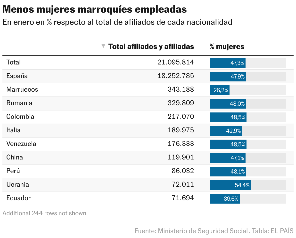 Del total de afiliados marroquíes a la Seguridad Social, solo un 26% son mujeres. Es una diferencia brutal respecto a la proporción de españolas, rumanas (48%), italianas (43%), colombianas o venezolanas (ambas 49%), las otras nacionalidades más numerosas del mercado laboral. Comparado con otros países africanos la diferencia es aún mayor que la de Marruecos: de los 54.665 afiliados senegaleses, solo el 12% son mujeres.