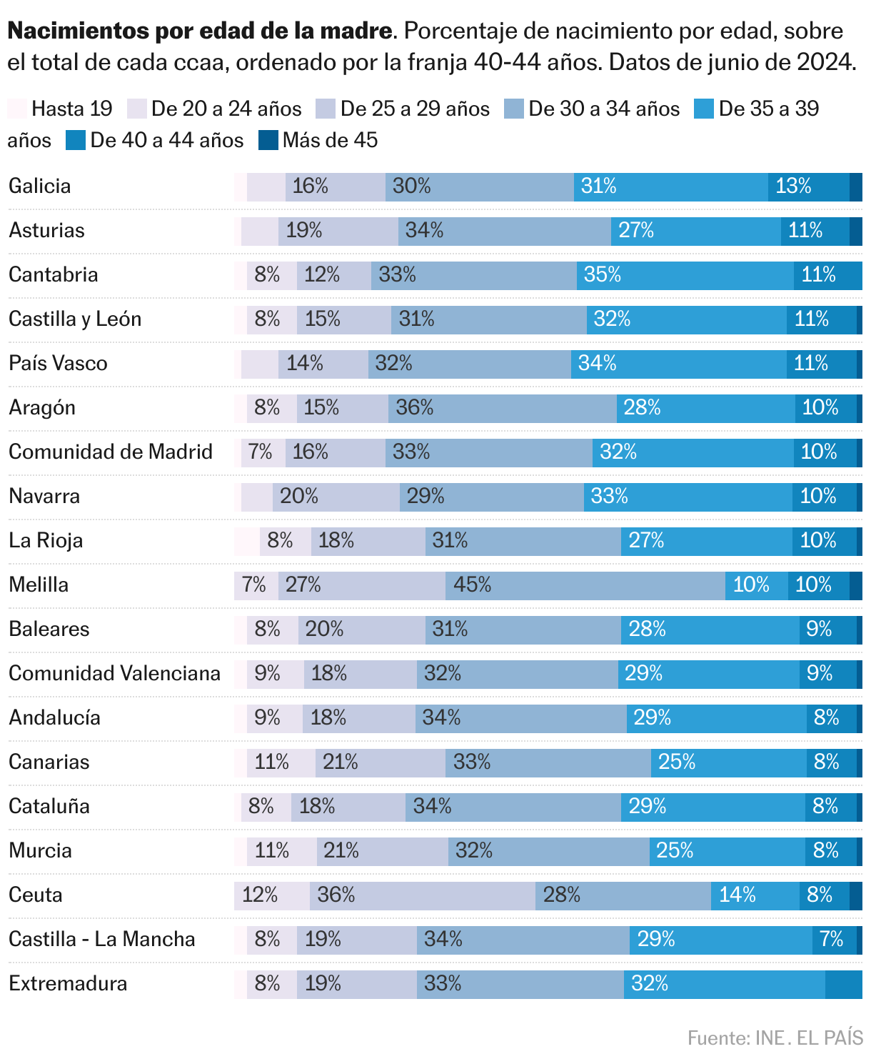 Si se compara con lo ocurrido en los primeros seis meses de 2014, en una década ha aumentado tres puntos el porcentaje de las madres mayores de 40 años, que entonces estaba por el 7%. Asimismo, si se analiza por territorios, las comunidades con más nacimientos de madres por encima de la cuarentena en lo que llevamos de 2024 han sido Madrid (3.049), Cataluña (2.699) y Andalucía (2.582), donde suponen el 11,8%, el 10,2% y el 8,8% de los natalicios, respectivamente. Sin embargo, la región donde más proporción de nacimientos de madres mayores ha habido ha sido Galicia, con un 14,5% del total; Asturias, con un 13%; y Cantabria, con un 12%. En concreto, en Galicia se han registrado hasta junio 824 nacimientos de madres de entre 40 y 44 años, 127 de madres de entre 45 y 49 años, y 8 de madres de más de 50 años, de un total de 6.593 natalicios. Al contrario, los territorios con menor porcentaje de madres mayores, han sido Melilla (6%), Ceuta (7,9%), Extremadura (8,1%) y Andalucía (8,8%).