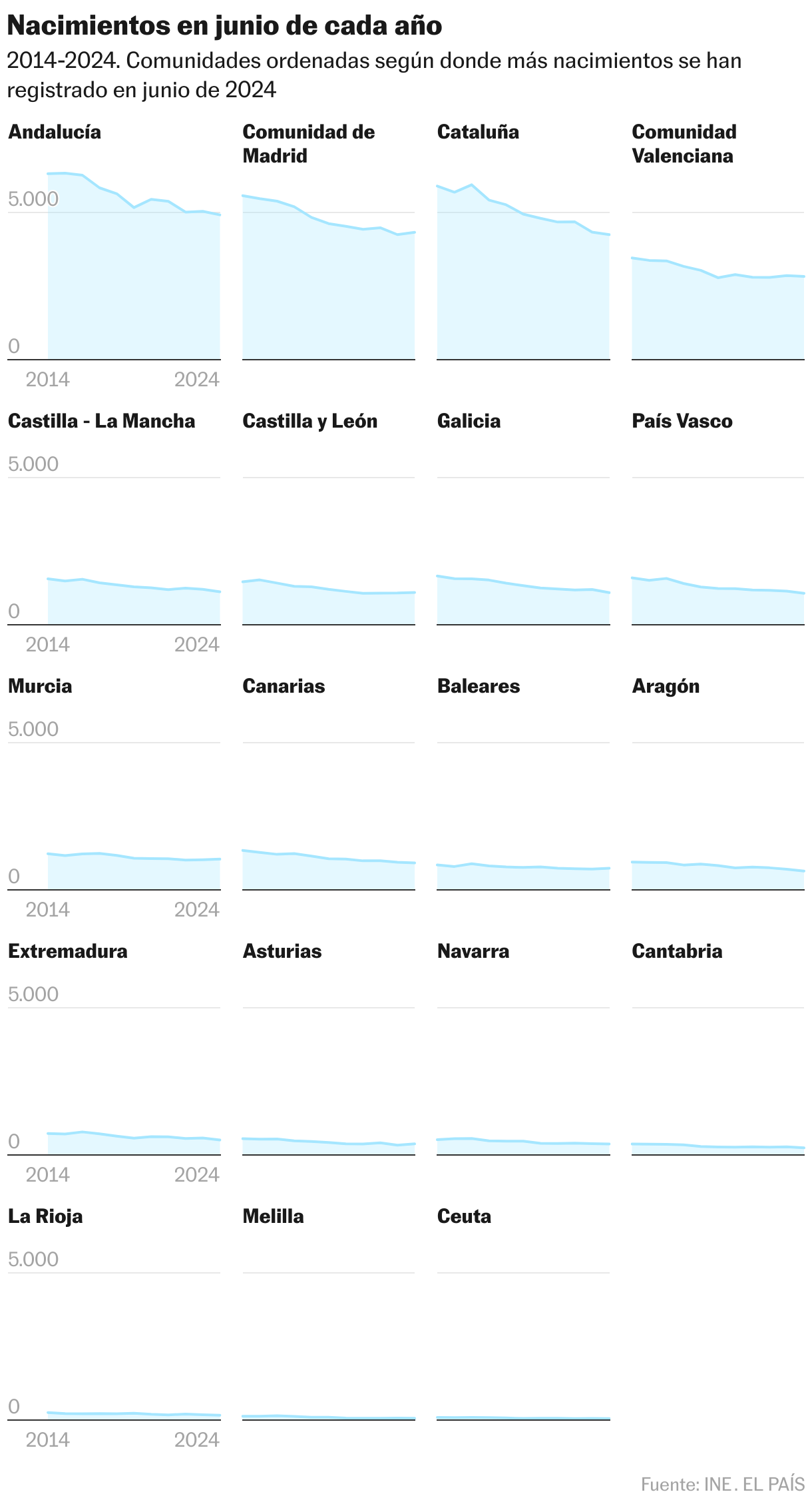 De esos 156.201 nuevos bebés, un 52% han sido niños y un 48%, niñas. De forma previsible, donde más nacimientos se han producido es en las comunidades autónomas más pobladas: Andalucía (29.481), Cataluña (26.525) y Madrid (25.936). Y, al contrario, donde menos se han producido es en los territorios con menos gente: las ciudades de Ceuta (316) y Melilla (400), así como las regiones de La Rioja (1.019), Cantabria (1.612) y Asturias (2.212).