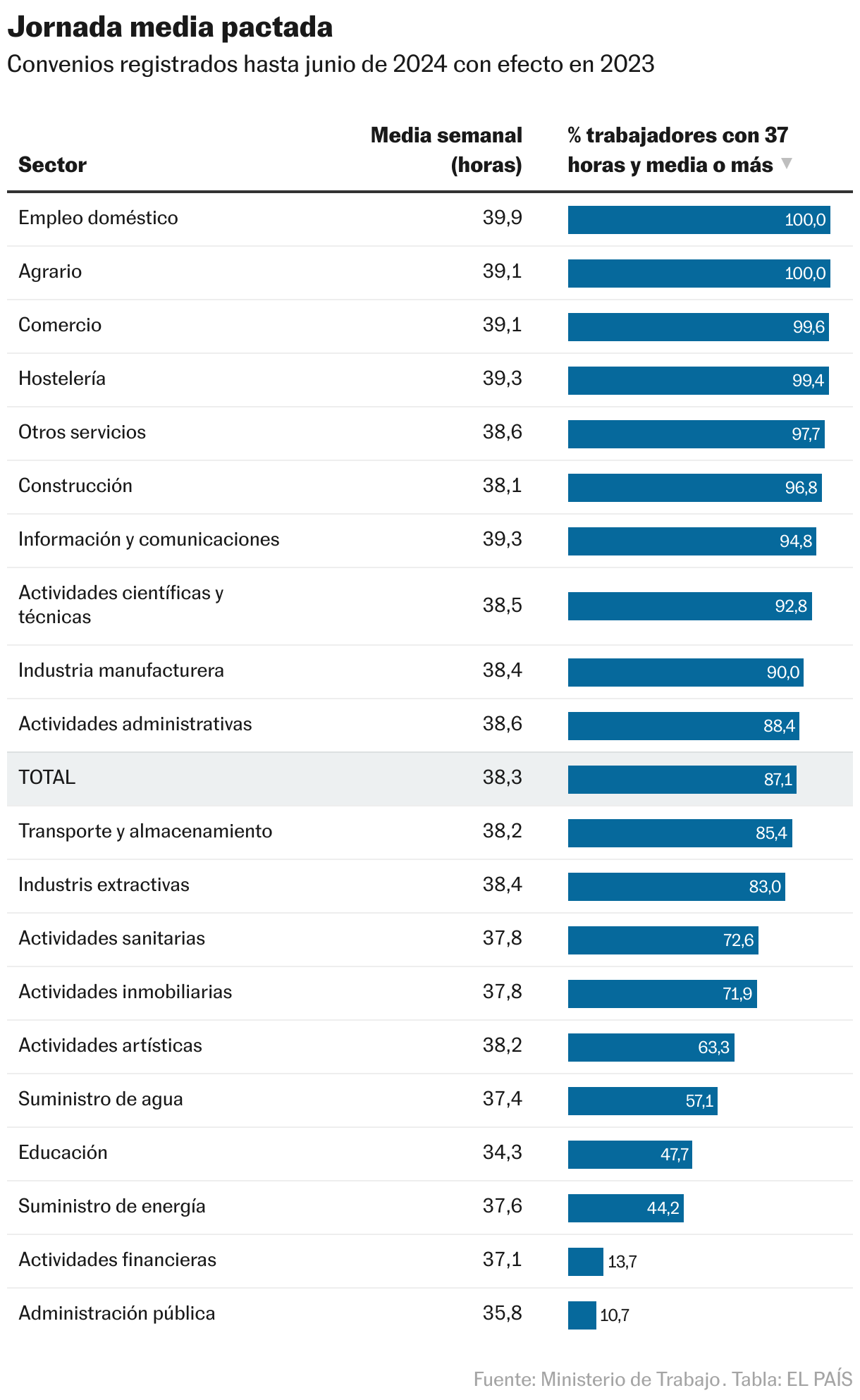 Aunque la jornada máxima legal no ha sufrido cambios en España en cuatro décadas, la negociación colectiva sí que ha logrado bajadas dependiendo del sector o la empresa. Es decir, patronales y sindicatos han acordado jornadas ordinarias inferiores a la máxima en diversos convenios colectivos. Así lo refleja la estadística del Ministerio de Trabajo, que sitúa el promedio semanal en 38,3 horas para 2023. En ese sentido, todos los sectores tienen jornadas medias pactadas por debajo de las 40 horas, aunque algunos rozan el límite. Tal es el caso del empleo doméstico (39,9 horas), seguido de la hostelería y las informaciones y comunicación, ambas con 39,3 horas.