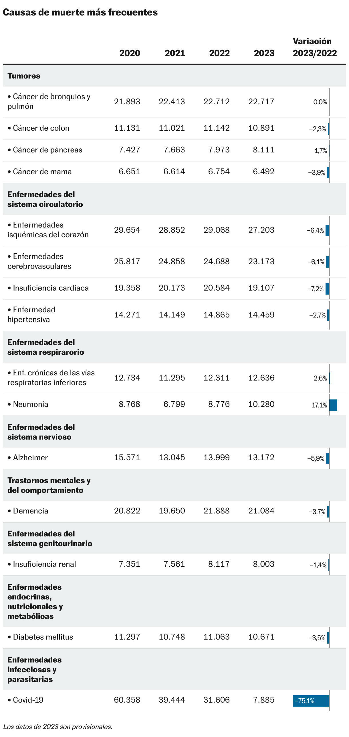 Por sexo, las enfermedades isquémicas del corazón fueron la primera causa de muerte entre los hombres (17.038 fallecidos), seguida del cáncer de bronquios y pulmón (16.503) y de las enfermedades cerebrovasculares (10.356). Entre las mujeres, la demencia se sitúa en primer lugar (14.225 fallecidas), seguida de las enfermedades cerebrovasculares (12.817) y la insuficiencia cardiaca (11.258).