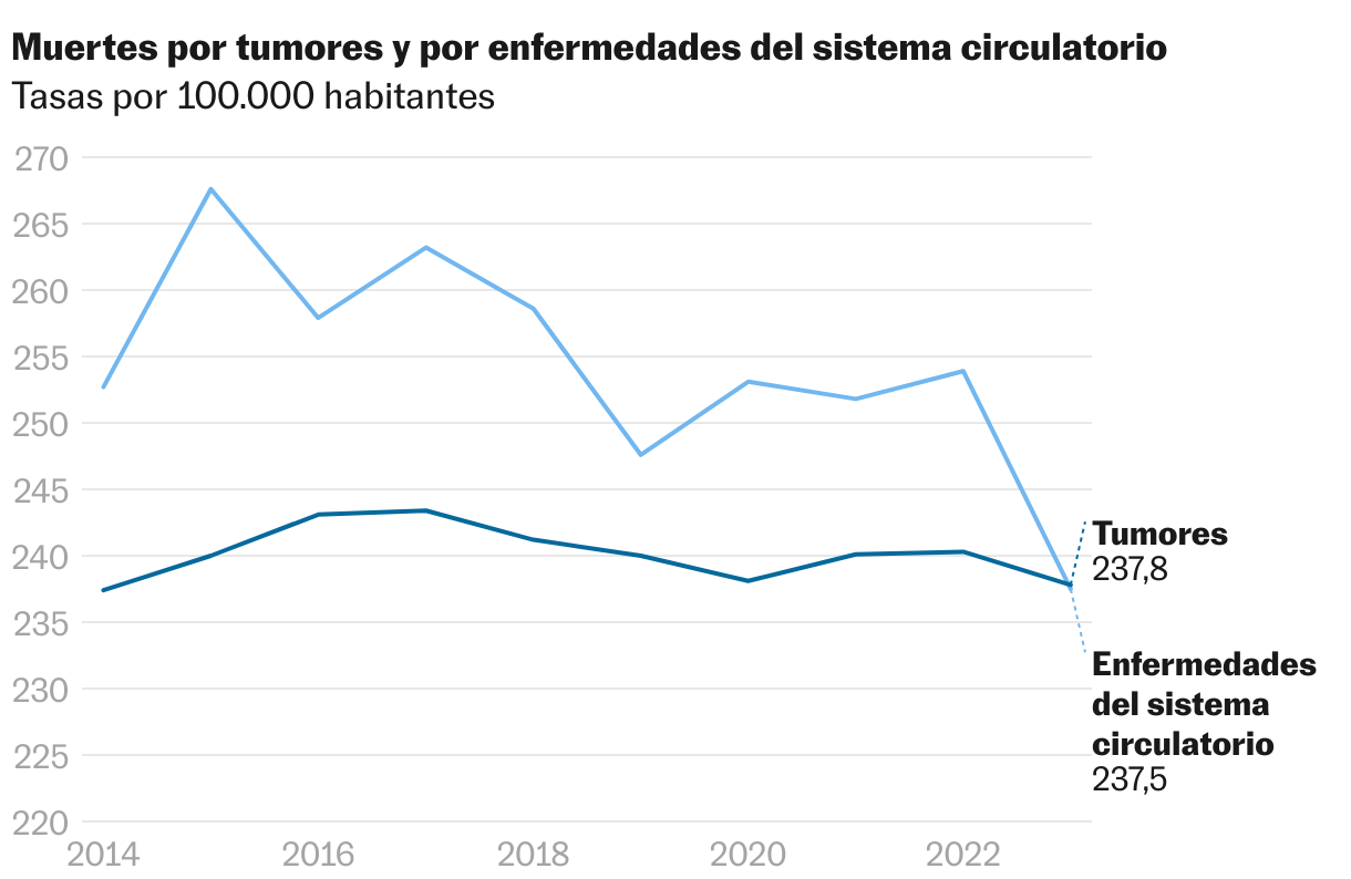 Entre las causas internas, los tumores superan por primera vez a las enfermedades del sistema circulatorio (destacan las patologías isquémicas del corazón) como principal causa de muerte en España. Un 26,6% de las 433.163 defunciones registradas en 2023 fueron motivadas por algún cáncer.