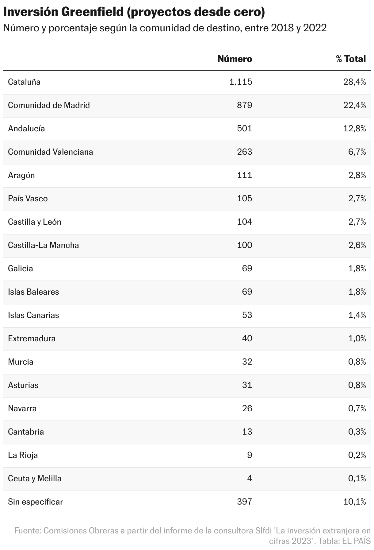Otro indicador útil son los proyectos greenfield, en los que un inversor extranjero construye desde cero las instalaciones con el objetivo de poner en marcha un proyecto, repercutiendo positivamente en el empleo. Entre 2018 y 2022, España recibió un total de 3.921 proyectos greenfield, el 28,4% destinados a Cataluña, el 22,4% a la Comunidad de Madrid y el 12,8% a Andalucía.