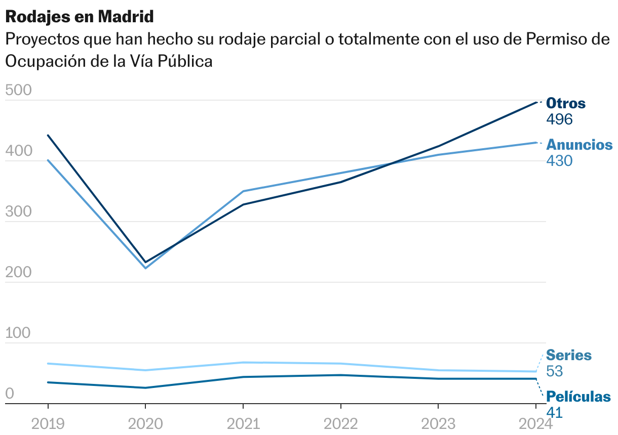 Desde Madrid Film Office sostienen que los datos de 2024 demuestran que la ciudad “continúa situándose como un plató privilegiado de rodajes de películas”. Esa industria consolidada de la que habla Dursi, queda reflejada cuando se ve una cartelera que asombra. El año pasado rodaron títulos como La habitación de al lado, de Pedro Almodóvar, con Juliane Moore y Tilda Swinton en los papeles protagónicos, o Padre no hay más que uno 5, de Santiago Segura. También nuevas series como Celeste (Movistar+) y Cuando nadie nos ve (Max), y las últimas temporadas de algunas ya aclamadas como Machos alfa (Netflix), Valeria (Netflix) y Reina roja: loba negra (Prime Video).